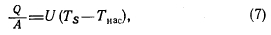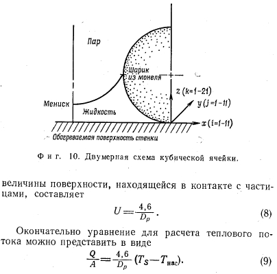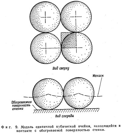 АНАЛИЗ И ОБСУЖДЕНИЕКОЭФФИЦИЕНТ ТЕПЛООТДАЧИ Анализ данных по теплообмену при испарении жидкости, приведенных на фиг. 5 и 6, показывает, что в отличие от кипения в большом объеме коэффициент теплоотдачи остается приблизительно постоянным для всех значений тепловых потоков ниже критических. Эго указывает на то, что механизм переноса тепла определяется теплопроводностью через тонкую пленку жидкости в слое примерно постоянной толщины, которая удерживается за счет действия капиллярных сил, возникающих в пористом материале на границе раздела жидкость — пар в пределах первого слоя частиц на поверхности нагрева. Ни опытные данные, ни визуальные наблюдения не обнаружили существования процесса пузырькового кипения. Среднее значение коэффициента теплоотдачи вычисляется по формуле ![]() что должно соответствовать на фиг. 6 и 7 прямой с наклоном, равным 1. Полученные результаты можно объяснить, анализируя последовательность процессов, происходящих при подводе тепла к поверхности нагрева. Следующее обсуждение и предложенная модель основаны на рассмотрении слоя, состоящего из сферических шариков. При низком уровне тепловых потоков перенос тепла от поверхности стенки осуществляется за счет теплопроводности и свободной конвекции. По мере увеличения теплового потока жидкость и шарики, находящиеся в контакте с поверхностью стенки, становятся перегретыми, т. е. значение температуры превышает температуру насыщения системы. При дальнейшем увеличении теплового потока перегрев слоя жидкости и шариков достигает такого значения, при котором образуется граница раздела жидкость— пар. Наиболее вероятным местом для образования этой границы раздела фаз является минимальный диаметр псры, образованный слоем шариков, находящихся в контакте с поверхностью стенки. Тепловой поток, передаваемый от поверхности стенки, проходит через слой жидкость — шарики к поверхности парообразования, находящейся у минимального диаметра поры в первом слое шариков. Тем самым все тепло, проходящее через поверхность стенки, идет на испарение жидкости. Приток жидкости к поверхности нагрева происходит через полости в слое шариков и носит ламинарный характер в отличие от турбулентного конвективного потока жидкости, вызываемого отрывом пузырьков пара при кипении в условиях большого объема. Затрудненность течения, обусловленного пористостью материала, приводит к образованию относительно неподвижного слоя жидкости на обогреваемой поверхности. Этот жидкий слой непрерывно получает новые порции жидкости за счет насосного действия капиллярных сил, что компенсирует расход жидкости за счет испарения. В работе Чэнга [2] показано, что действие капиллярных сил не зависит от процесса испарения, происходящего на границе раздела жидкость — пар. Поэтому расчет движущего напора может быть проведен на основе экспериментальных данных по капиллярному подъему жидкости путем учета влияния изменения температуры на коэффициент поверхностного натяжения и плотность. На основе предложенного механизма процесса с помощью численных методов была решена трехмерная задача теплопроводности для следующих условий: 1. Тепло передается за счет теплопроводности через тонкий слой жидкость — шарики, находящийся в контакте с обогреваемой поверхностью. Толщина слоя жидкости определя