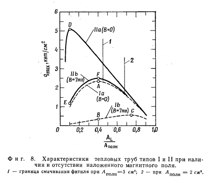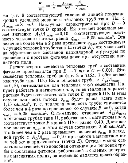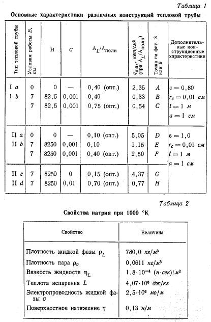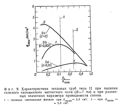 ЧИСЛЕННЫЙ ПРИМЕРУравнение (7) было решено для ряда конструкций тепловых труб, основные результаты расчетов приведены в табл. 1. Для всех конструкций были приняты одинаковыми следующие основные характеристики. В качестве рабочей жидкости использовался натрий при температуре 1000 °К. Все свойства натрия (табл. 2) взяты из работы [14], исключение составляют лишь р„ и у, заимствованные из работ [15] и [16] соответственно. Полная длина всех тепловых труб была! принята равной 1 м, а их высота в направлении действия магнитного поля В равной 2а = = 2 см (фиг. 7). ![]() В тепловых трубах типа I использовалась простая фитильная структура со средним радиусом капиллярных пор гс =0,01 см. Объемная доля жидкости в этой конструкции фитиля была принята равной е = 0,8; извилистостью каналов для прохода жидкости пренебрегали, считая эффективную длину каналов равной 1 м. Среднее значение формпараметра для этих каналов было принято равным единице; таким образом, величина безразмерного градиента давления для обычного ламинарного течения равнялась Ри (Н = 0) 7,11. При этом считалось, что проходное сечение канала приблизительно имеет форму квадрата. Для фиксированного значения формпараметра, полученного из уравнения (7), решение для qmax зависит только от отношения проходных сечений AL/An0JlH, но не зависит от абсолютной величины сечений. Фитиль занимает площадь AL = 8ab (фиг. 7). Характеристика тепловой трубы типа 1а рассчитывалась при значении Н = 0 (В =0). Из анализа соответствующей пунктирной кривой на фиг. 8 видно, что имеется целое семейство подобных конструкций, соответствующих различным значениям отношения. Оптимальная конструкция отвечает точке А на графике, при этом отношение AJAnолн = 0,4, а максимальная плотность теплового потока в осевом направлении равна 2,35 квт/см2. Характеристика второго семейства тепловых труб (тип 1е) рассчитывалась с учетом дополнительного перепада давлений, связанного с наличием магнитного поля с индукцией В = 7 тл, характерное отношение проводимостей С = 0,001. Если тепловая труба, геометрические характеристики которой соответствуют точке А на кривой 1а, будет работать в магнитном поле с указанной индукцией, то ее рабочая характеристика будет соответствовать точке В на второй пунктирной кривой, показанной на фиг. 8. То есть при AJAn0„K = 0,4 из-за дополнительного перепада давлений достижимая величина qmaX снизится с 2,35 до 0,33 квт/сма. Если использовать другую тепловую трубу, оптимизированную для данных условий работы, то у нее отношение площадей будет равно 0,75, однако увеличение достижимой плотности теплового потока qmax будет довольно скромным, до 0,54 квт/см2 (точка С). Из приведенного примера можно сделать вывод, что тепловые характеристики тепловых труб типа I резко ухудшаются при работе в сильных магнитных полях даже при оптимальном выборе применительно к этим условиям их геометрических характеристик. ![]() При использовании тепловых труб типа II с составным фитилем можно добиться существенного снижения потерь давления, обусловленных действием магнитного поля. В этих тепловых трубах имеются два канала для прохода жидкости размером 2а X 2Ь, как показано на фиг. 7. Считается, что эти два канала для прохода жидкости отделены от парового канала сетками с тем же эффективным радиусом пор гс =0,01 см, как и в простом фитиле тепловой трубы типа I. Рассмотрим первое семейство т