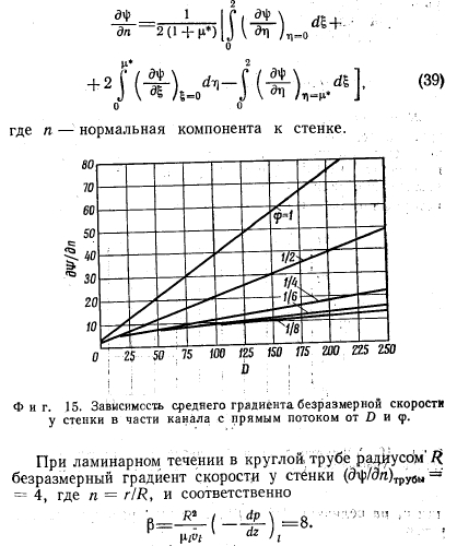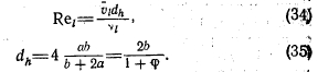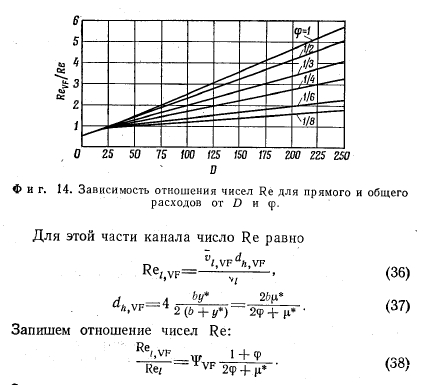 ЧИСЛО Re И ГРАДИЕНТ СКОРОСТИ У СТЕНКИ КАНАЛАЧисло Re для всего канала определялось по гидравлическому диаметру, равному учетверенному поперечному сечению, деленному на смоченный периметр, что имеет физический смысл только для случая D = 0, когда отсутствует трение пара: ![]() Так как в случае D = 0 поверхность жидкости движется свободно, в смоченном периметре dh, учитываются толькф твердые стенки канала (Ь + 2а). Сохраним формально определение числа Re также для значений D Ф О, хотя канал в этом случае разделен нульизотахой на две части. Движение в части канала с прямым расходом можно считать течением в замкнутом прямоугольном канале (шириной b, высотой у) со средней скоростью vt VF = = VVF/by, поскольку поверхность нульизотахи проявляется здесь как твердая смоченная стенка. ![]() Зависимость этого отношения от D для разных ср показана на фиг. 14. Видно, что число Re для части канала с прямым расходом может быть в 5—6 раз больше числа Re для общего расхода. Поскольку обычно в тепловой трубе число Re для общего расхода не больше 200. течение в Части с прямым расходом можно считать ламинарный,- хотя градиент скорости у. стенки может быть значительным. Результаты расчета средних градиентов скорости у стенки в нижней части канала с прямым расходом предт ставлены на фиг. 15: ![]() Таким образом, при ламинарном течении в открытых канавках при наличии трения пара о жидкость возникают намного большие градиенты скорости , у стенки, чем в случае ламинарного течения в трубе. При использовании полученных здесь соотношений необходимо следить, чтобы ReVF не превышало 2300. При больших Re движение может стать турбулентным и уравнение (1) окажется несправедливым. В случае тепловой трубы число Re обычно не превышает 1000 и течение — ламинарное. |