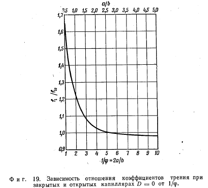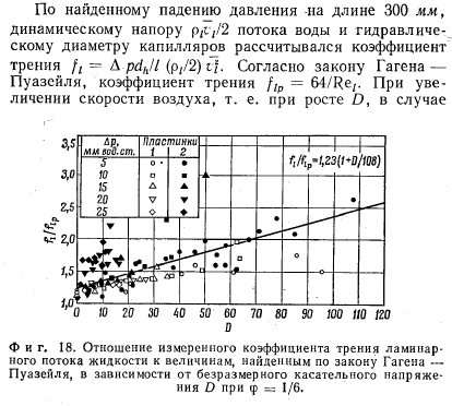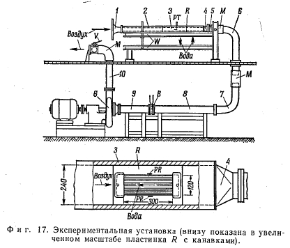 ЭКСПЕРИМЕНТКак показал расчет, коэффициент трения при ламинарном течении жидкости в капиллярах тепловых труб увеличивается вследствие трения пара в 3—4 раза по сравнению со случаем без трения пара в зависимости от геометрии капилляра ф и безразмерного касательного напряжения D [уравнения (23) и (24)1. При решении уравнения Навье — Стокса предполагалось, что на поверхности жидкости напряжение постоянно и поверхностных волн не возникает. Согласно первому допущению, трение пара на поверхности жидкости и на твердой стенке между капиллярами одинаково, и поток пара в тепловой трубе с заполненными жидкостью капиллярами ведет себя так же, как в гладкой трубе. Измерения, проведенные в работе [8], показали, что касательные напряжения при движении воздуха над бесконечной водной поверхностью несколько больше, чем в случае движения у стенок. При скорости воздуха большей 1,6 м/сек (в тепловых трубах скорости пара значительно больше) наблюдалась небольшая рябь. Подобные волновые движения обнаружены для случая текущей пленки воды с движущимся над ней воздухом [9]. Для рассматриваемых здесь небольших канавок (капилляров) поверхностное натяжение препятствует волнообразованию. Указанные особенности процесса делают целесообразным экспериментальное изучение влияния потока пара на движение жидкости в капиллярах. ![]() Экспериментальная установка показана на фиг. 17. У основания канала 3, выполненного из плексигласа, шириной 240 мм и высотой 85 мм установлены латунные пластинки R с продольными капиллярными канавками (длина канавки 300 мм). Латунь выбрана из-за хорошей смачиваемости. Исследовались две геометрии рабочих участков: пластинка шириной 120 мм, имеющая 120 канавок с размерами b = 0,5, а = 1,5, s = 0,5 мм (фиг. 1), и пластинка шириной 120 мм, имеющая 60 канавок с размерами b = 1,0, а = 3,0, s = 1 мм. Подвод и отвод воды, текущей по канавкам, осуществлялся с помощью закрытых поперечных каналов шириной 40 мм и глубиной 6 мм. Расход воды измерялся объемным способом, при этом контролировалось заполнение канавок водой и отсутствие пузырей. Над пластинкой R навстречу потоку жидкости двигался поток воздуха, подводимый через входное устройство 1 и входной участок 2. Через воздухопроводы 4—9 и диафрагму В для измерения расхода воздух отсасывался компрессором G и выпускался через дроссельную заслонку V. Для устранения вибрации после измерительного канала 3 установлены резиновые муфты М. Канал вместе с участком входа наклоняется с помощью коромысла W, вследствие чего можно получать различные градиенты давления для воды, текущей в продольных канавках. В предварительных опытах с помощью подвижных трубок Пито РТ установлено, что профиль скорости воздуха непосредственно перед входом в участок с капиллярами практически прямоугольный. Касательные напряжения между воздухом и пластинками и, таким образом, между воздухом и водой измерены с помощью двух трубок Престона PR [10], установленных на пластинках непосредственно у крайних канавок. На основе этих измерений и средней скорости воды в капиллярах находились безразмерные касательные напряжения D по уравнению (13). Средняя скорость воды определялась путем измерения ее общего расхода и площади поперечного сечения всех капилляров.- По методу расчета, предложенному Римбергом [11], проверено, что потери давления на входе и выходе из капилляр