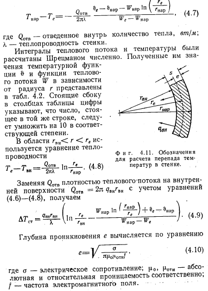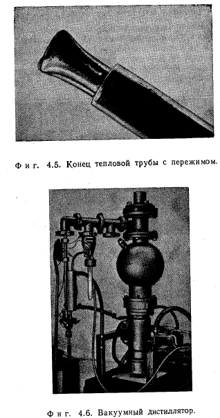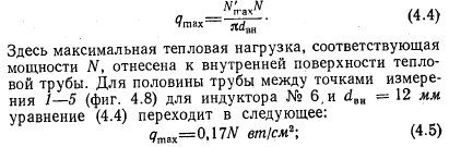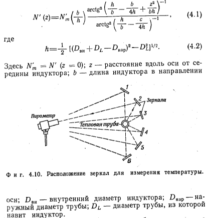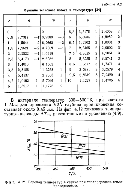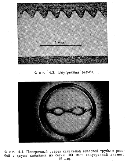 ЭКСПЕРИМЕНТЫЭКСПЕРИМЕНТАЛЬНАЯ УСТАНОВКА Экспериментальная установка (фиг. 4.1) для исследования тепловых труб, в которых в качестве теплоносителя используется вода, в основном состоит из трех систем: систем обогрева тепловой трубы, ее охлаждения и температурных измерений. Обогрев осуществляется токами высокой частоты (1 Мгц) при помощи индуктора, образованного цилиндрической обмоткой. Тепловая труба для охлаждения помещена в калориметр, охлаждаемый водой, который одновременно служит опорой для всей установки. Абсолютная температура за пределами зоны нагрева измеряется при помощи термопар, распределение температуры — по периметру и величина перегрева в зоне нагрева — с помощью инфракрасного пирометра. Шесть зеркал позволяют измерять температуры на половине периметра тепловой трубы между витками индуктора. Более подробное описание отдельных измерений дано в разд. 4.4 и 4.5. КОНСТРУКЦИЯ И ТЕХНОЛОГИЯ ИЗГОТОВЛЕНИЯ РЕЗЬБОВЫХ КАНАЛЬНЫХ ТЕПЛОВЫХ ТРУБ Изготовление резьбы. Резьба нарезается в трубах на токарном станке; при этом выбор соответствующей подачи обеспечивает получение желаемого шага резьбы. Инструмент для нарезания резьбы (фиг. 4.2) представляет собой обычный удлиненный резец для нарезки внутренней резьбы, который проходит через всю трубу. Он зажимается в суппорте. Для центрирования его в трубе служит втулка, надетая на шлифованную цилиндрическую поверхность стержня резца. Наружная поверхность втулки покрыта слоем тефлона. Ее наружный диаметр (вместе со слоем тефлона) точно равен внутреннему диаметру трубы. Втулка сидит на стержне резца с эксцентриситетом ~0,5 мм. Желаемая глубина резьбы устанавливается поворотом втулки на стержне резца. Установленное положение втулки закрепляется резьбовыми штифтами. Этот способ позволяет точно установить расстояние между острием резца и осью трубы. Такая технология создает два преимущества: во-первых, таким образом резец точно и стабильно подается вдоль гладкой внутренней поверхности трубы, во-вторых, удаление стружки не вызывает никаких затруднений. ![]() Изготовленные тепловые трубы имеют внутренний диаметр 12 мм, шаг резьбы 0,2 или 0,3 мм и длину 300 мм. При трубах больших диаметров необходимость в направлении инструмента в трубе может отпасть. Постоянный профиль резьбы может быть получен только при условии, что допуск на внутренний диаметр трубы мал по сравнению с глубиной нарезки. Применяемые глубины лежат в пределах от 0,05 до 0,5 мм. Это значит, что в любом случае для изготовления тепловых труб необходимы заготовки из прецизионных труб. ![]() На фиг. 4.3 показана резьба с углом при вершине 60° и шагом 0,3 мм. На фиг. 6.1—6.4 в разд. 6.1.1 показано, насколько могут быть велики отклонения профиля резьбы, нарезанной с помощью не очень точно шлифованного инструмента в трубах, имеющих допуски на внутренний диаметр, соответствующие обычным торговым трубам. Изготовление каналов. Для каналов в изготовленных тепловых трубах использовалась сетка 100 меш с отверстиями 0,15 мм в свету из проволоки V2A диаметром 0,11 мм. Соединение обеих сеток производится точечной сваркой в плоском шаблоне. Окончательная форма поперечного сечения каналов (фиг. 4.4) легко придается протягиванием двух протяжек между двумя слоями сеток. При этом стенки каналов образуют своего рода пружину, которая после удаления протяжек вд