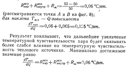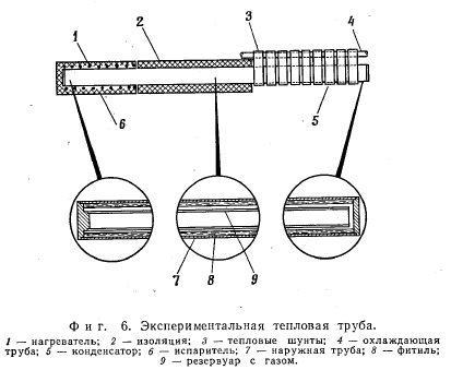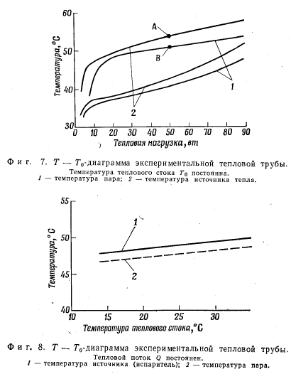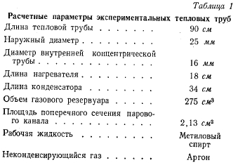 ЭКСПЕРИМЕНТАЛЬНАЯ САМОРЕГУЛИРУЮЩАЯСЯ ТЕПЛОВАЯ ТРУБАЧтобы оценить способность регулирования температуры тепловой трубы изменяемой проводимости с неконденсирующимся газом, была испытана ее экспериментальная модель. Труба была саморегулирующейся, т. е. количество неконденсирующегося газа и его объем поддерживались постоянными. Исследование имело своей целью установить зависимость температуры пара (и температуры теплового источника) от теплового потока и температуры холодного источника. КОНСТРУКЦИЯ ТРУБЫ Экспериментальная тепловая труба представлена на фиг. 6. Газовый объем размещается внутри тепловой трубы в концентрической трубе. Расчетные параметры приводятся в табл. 1. Мощность изменялась от 0 до 100 в т. Расчет фитиля был выполнен по данным работы [9]; расчетная мощность тепловой трубы в горизонтальном положении была принята равной 200 вт. Поскольку изучались только возможности регулирования, при расчете трубы был введен запас по передаваемой мощности. ![]() ![]() Тепло к испарителю подводилось от электронагревателя сопротивления, намотанного на трубу. Тепло от конденсатора отводилось при помощи водяного охлаждения. Как показано на фиг. 6, охлаждающая труба соединялась с тепловой трубой параллельными тепловыми шунтами, изготовленными из медных полосок шириной 25 мм и толщиной 1 мм. Набор шунтов был применен с целью сведения к минимуму теплового потока теплопроводностью в осевом направлении. В то же время обеспечивался интенсивный теплоотвод на единицу длины трубки. ЭКСПЕРИМЕНТАЛЬНЫЕ ДАННЫЕ Труба переменной проводимости исследовалась с разными количествами неконденсирующегося газа. Проводилось два рода исследований. Так, была исследована зависимость температуры пара Тп и температуры теплового источника Тит от нагрузки при постоянной температуре холодного источника (температура охлаждающей воды). В эксперименте измерялась температура пара в адиабатической части трубы, которая является средней между ТпСПи Тп0НД. Температура источника измерялась на трубе под нагревателем. Характеристики тепловой трубы для двух различных количеств газа представлены на фиг. 7. ![]() Кроме того, исследовалась зависимость температуры пара (теплового источника) от температуры холодного источника. Экспериментальная кривая показана на фиг. 8. СРАВНЕНИЕ ТЕОРИИ С ЭКСПЕРИМЕНТОМ В случае постоянной температуры холодильника рас - четный наклон ТП — Q-зависимости дается уравнением (17). Значения параметров уравнения (17) для характерной точки Л приводятся в табл. 2. Измеренный наклон кривой в указанной точке dTJdQ оказался равным 0,065 °С/бт, а температурная чувствительность а = = 15,3 ш/°С. Эти значения хорошо согласуются с расчетными. Из практических соображений более важно проследить за изменением температуры источника. Температура источника связана с температурой пара уравнением (5). Вычисленное значение термического сопротивления между тепловым источником Гист и паром Тп оказалось равным 0,053 °Сjem (основными составляющими этого сопротивления являются сопротивление стенки и слоя жидкости в фитиле). ![]() В эксперименте получены следующие значения: для сопротивления ![]() Однако дальнейшее уменьшение может быть достигнуто, если уменьшать термическое сопротивление в испарителе. В случае постоянного теплового потока расчетный наклон ТП характерис