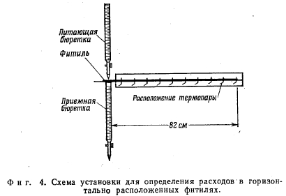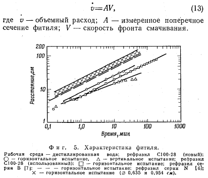 ИСПЫТАНИЯ КОНСТРУКЦИОННОГО МАТЕРИАЛА ФИТИЛЯМатериал фитиля рефразил С100-28 испытывался вне тепловой трубы. На фиг. 4 показана аппаратура, использованная при проведении этих испытаний. Был разработан метод, который позволял оценивать максимальную тепловую нагрузку тепловой трубы на основе сравнительно простого испытания фитилей. Цель экспериментального исследования состояла в получении данных о перемещении фронта жидкости и объемном расходе в зависимости от времени при тех же изотермических условиях, которые имеют место в тепловой трубе. Объемный расход в фитиле рассчитывали двумя способами. Сначала объемный расход вычисляли с помощью следующего уравнения: ![]() ![]() Скорость фронта смачивания V находили путем дифференцирования уравнения движения, полученного на основе обработки результатов, представленных на фиг. 5. Поскольку жидкость занимает только часть общего поперечного сечения фитиля, объемный расход, рассчитанный таким способом, будет больше объемного расхода, определяемого по второму способу. Этот непосредственный способ определения объемного расхода заключается в измерении суммарного объема жидкости, которая вводится в фитиль заданной длины. Если суммарный объем жидкости разделить на время, необходимое для заполнения фитиля, то можно определить объемный расход жидкости для фитиля, длина которого равна половине действительной длины. Из уравнения (9) следует, что массовый расход обратно пропорционален длине фитиля. Объемный расход для фитиля требуемой длины может быть получен путем умножения экспериментально полученного значения на соответствующее отношение длин. Такой способ определения объемных расходов для фитилей различной длины оказывается приемлемым только в том случае, когда фитиль расположен горизонтально [см. уравнение (7)1. Таким образом, этот метод позволяет найти максимальную тепловую нагрузку тепловой трубы без оценки параметров фитиля k и г. Экспериментальная установка для исследования фитиля, представленная на фиг. 4, состоит из трех основных элементов. Подача дистиллированной воды осуществлялась питающей бюреткой (объем 100 мл), причем избыток воды из насыщенного конца фитиля удалялся в приемную бюретку объемом 50 мл. Суммарный объем жидкости, переносимый фитилем, определялся по разности показаний питающей и сборной бюреток. Фитиль был укреплен на сетчатом экране с размером ячеек 1 см? и располагался в плексигласовой трубке с внутренним диаметром 3,2 см, причем конец [фитиля, где осуществлялась подача воды, располагался вне трубки. Эта трубка уменьшала потери, связанные с испарением в фитиле. Перед каждым опытом в трубку помещался на несколько часов насыщенный фитиль для создания насыщенной атмосферы вокруг фитиля. К опорному экрану по всей длине фитиля были прикреплены пары медных изолированных проволочек. Концы проволочек, с которых изоляция была снята, входили в поры фитиля. Расстояние между парой проволочек в поперечном сечении фитиля равнялось ~1 см, а расстояние между парами по длине фитиля ~5 см. Все проволочки были подсоединены к 25-точечному термопарному переключателю, подключенному к общему омметру. Когда фитиль был сухим, показание омметра свидетельствовало о бесконечно большом сопротивлении на каждой паре проволочек. Когда же то место фитиля, где располагались концы про