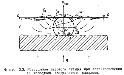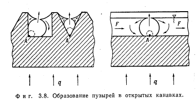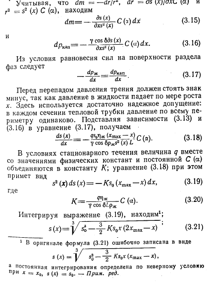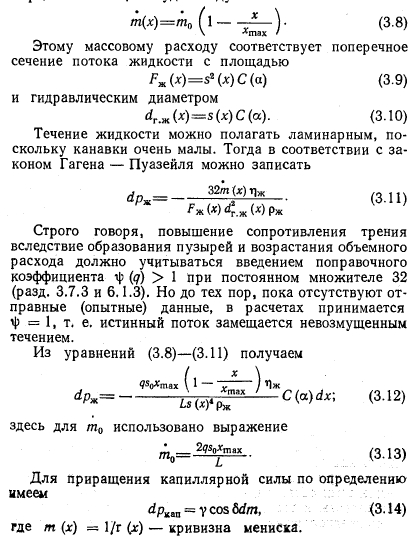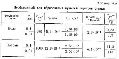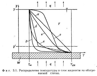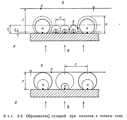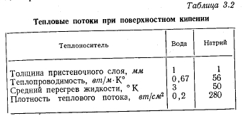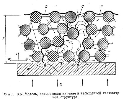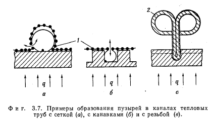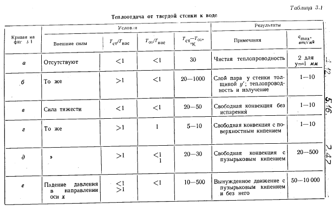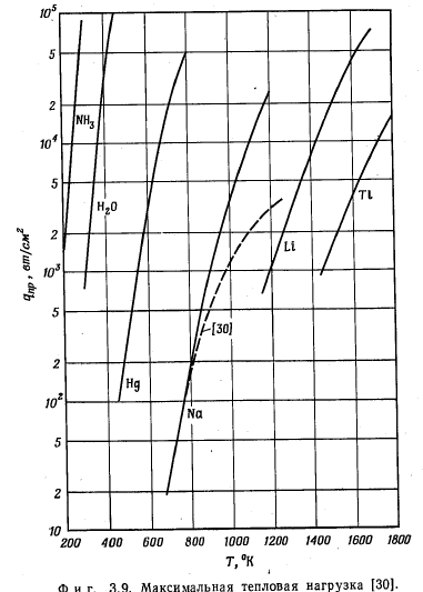 МАКСИМАЛЬНАЯ ТЕПЛОВАЯ НАГРУЗКАОПРЕДЕЛЕНИЕ Под максимальной тепловой нагрузкой поверхности нагрева понимают такую плотность теплового потока, при которой энергия, подведенная к элементу поверхности, как раз равна максимальной величине энергии, которая может быть отведена от него каким-либо способом. Если поверхность охлаждается за счет кипения в слое жидкости, то речь идет о критических тепловых потоках. Последние достигаются тогда, когда пузырьковое кипение переходит в пленочное (разд. 3.4). С этим эффектом связано ограничение отвода тепла от обогреваемого элемента поверхности, которое имеет следствием повышение температуры стенки. Критические тепловые потоки для испарителей, применяемых в технике, большей частью очень велики (100—500 вт/см2) по сравнению с теплоемкостью стенки. Поэтому превышение их часто приводит к расплавлению стенки. Это явление носит название пережога, а соответствующие тепловые нагрузки называют максимальными. РАСПРЕДЕЛЕНИЕ ТЕМПЕРАТУРЫ В СЛОЕ ЖИДКОСТИ НА ОБОГРЕВАЕМОЙ СТЕНКЕ В слое холодной жидкости, покрывающем обогреваемую стенку, устанавливается температурное поле. Среди других причин непосредственное влияние на распределение температуры оказывают силы, приложенные к жидкости извне. Тем самым внешние силы непосредственно влияют на количество тепла, которое может быть отведено жидкостью от стенки. С помощью фиг. 3.1 поясняются некоторые возможные случаи теплоотдачи к жидкости; в качестве примера служит вода. Горизонтальная стенка W, обогреваемая тепловым потоком q и имеющая температуру Гст, покрыта слоем жидкости F. Жидкость имеет свободную поверхность, расположенную на расстоянии у = Y от стенки. Поступающее в жидкость тепло отводится от свободной поверхности. На этой поверхности температура жидкости равна Тт. ![]() ![]() Тепловые потоки дтах, достижимые при различных условиях, приведены в табл. 3.1. Приведенные числа характеризуют только порядок величин и будут обсуждены в разд. 3.3 и 3.9. В условиях вынужденного движения роль свободной поверхности играет середина потока. Сравнение случаев отчетливо показывает влияние силы тяжести; именно этим влиянием объясняется возрастание плотности теплового потока qmax в условиях д по сравнению с условиями б в 100 раз при одинаково малых перегревах стенки ТСТ — Тоз. ПОВЕРХНОСТНОЕ КИПЕНИЕ Экспериментальные исследования проводились только на горизонтально расположенных тепловых трубах малого диаметра. Поэтому поверхностное кипение должно быть рассмотрено в первую очередь в условиях, когда можно пренебречь внешними силами. Их влияние оказывает неблагоприятное действие на максимальную тепловую нагрузку поверхности нагрева в верхней половине зоны нагрева горизонтально расположенной тепловой трубы. По этой причине это место является наиболее опасным в отношении пережога (разд. 3.9.4). Таким образом, при поверхностном кипении в условиях невесомости тепло может отводиться от стенки только путем теплопроводности через слой жидкости или излучением через слой пара. При этом в противоположность случаям а и б (табл. 3.1) температура поверхности жидкости в точности равна температуре насыщения. Решающее значение для величины возможных тепловых нагрузок поверхности нагрева имеют толщина слоя у стенки и наибольший возможный перегрев стенки Тст — Гнас, при которо