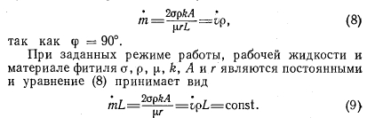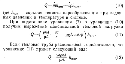 МАКСИМАЛЬНАЯ ТЕПЛОВАЯ НАГРУЗКА И РАСХОДПри подстановке уравнений (3)—(5) в уравнение (1) получим выражение максимального расхода жидкости через фитиль ![]() Если тепловая труба расположена горизонтально, то уравнение (7) принимает следующий вид: ![]() Поскольку количество переносимого тепла, определяемое скрытой теплотой, велико, а перепад температур вдоль тепловой трубы мал, теплопереносом за счет теплопроводности, радиации и конвекции можно пренебречь. Поэтому, предполагая, что вся тепловая энергия передается в виде скрытой теплоты, найдем выражение для тепловой нагрузки ![]() При выводе уравнений (11) и (12) были сделаны следующие допущения: 1) гравитация не оказывает влияния на течение пара; 2) течение жидкости в капиллярах фитиля является ламинарным; 3) потери на трение в паре пренебрежимо малы; 4) теплоперенос за счет теплопроводности, радиации и конвекции вдоль тепловой трубы пренебрежимо мал; 5) свойства жидкости постоянны вдоль тепловой трубы; 6) течение и теплоперенос по существу являются одномерными; 7) фитиль является равномерно насыщенным; 8) концевые эффекты пренебрежимо малы; 9) изменение количества движения пренебрежимо мало. |