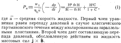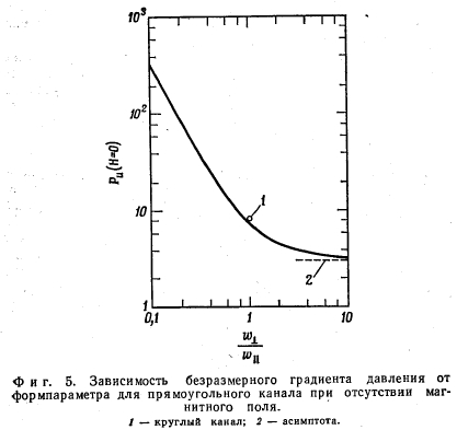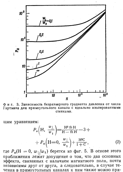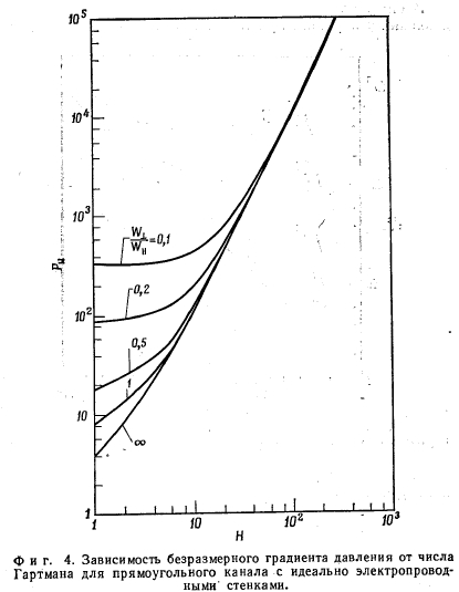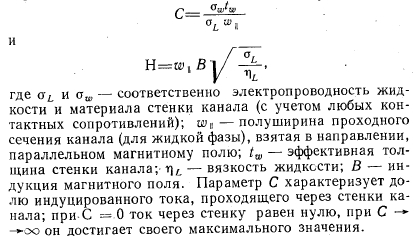 ПЕРЕПАД ДАВЛЕНИЯ ПРИ ТЕЧЕНИИ ЖИДКОСТИ В ОДНОРОДНОМ МАГНИТНОМ ПОЛЕГрадиент давления при течении электропроводной жидкости в однородном поперечном магнитном поле зависит от геометрии канала, отношения проводимостей стенки и жидкости С и числа Гартмана Н. Последние два важных безразмерных параметра определяются следующим образом: ![]() Число Гартмана Н характеризует соотношение пондеромоторных и вязкостных сил в жидкости. Оно определяет интенсивность замкнутых токов в жидкости, индуцированных магнитным полем. При Н=0 мы имеем дело с обычным падением давления в вязкостном несжимаемом пограничном слое. С увеличением Н градиент давления возрастает, при этом, как будет показано в дальнейшем, градиент давления, является функцией как Н, так и С В случае течения между параллельными пластинами имеется простое аналитическое выражение для градиента давления, справедливое для всех значений С и Н. Для других геометрий канала (в частности, для круглого и прямоугольного каналов) получены точные решения в виде бесконечных рядов. Однако эти выражения очень громоздки. К счастью, градиент давления в этих каналах может быть достаточно точно аппроксимирован простой эмпирической формулой, полученной на основе решения для случая течения между параллельными пластинами. Выражение для градиента давления при полностью развитом ламинарном течении несжимаемой жидкости между параллельными пластинами и при наличии однородного поперечного магнитного поля было получено в работе. Это выражение может быть записано следующим образом: ![]() В работах [4,5] были получены соотношения для градиента давления при полностью развитом ламинарном течении несжимаемой жидкости в прямоугольном канале при наличии однородного поперечного магнитного поля для двух предельных случаев С = 0 и С =оо. В обоих случаях решение получается в виде бесконечного ряда. На фиг. 3 представлены результаты расчетов с помощью этих рядов для случая С = 0, а на фиг. 4, представляющий собой отношение полуширины канала в направлении, перпендикулярном магнитному полю, к полуширине канала в направлении, параллельном магнитному полю. На обоих графиках показаны кривые, соответствующие случаю течения между плоскими параллельными пластинами (w±/w\i = оо). В случае течения в прямоугольном канале градиент давления с хорошим приближением описывается следую- ![]() ![]() Для того чтобы получить достаточно точные результаты при Н-0 для прямоугольных каналов, уравнение ![]() Это эмпирическое уравнение является точным и при очень больших значениях Н и дает незначительные ошибки при промежуточных значениях Н. Например, при С = 0 и при значениях формпараметра больше 0,1 ошибка в определении Ри никогда не превышает 11%. При С =оо ошибка почти на порядок меньше. При значениях С, лежащих между 0 и оо,-точные решения отсутствуют. Однако представляется достаточно обоснованным допущение о том, что в этом случае погрешность расчета по приближенной формуле будет меньше погрешности определения Ри при С = 0. Уравнение (2) также дает хорошее приближение и для градиента давления в круглом канале [в этом случае Ри(Н =0) =8,0]. Точное решение, представляющее собой бесконечный ряд функций Бесселя, было выведено Ихара [6]. Расчет с помощью приведенного в работе аналитического выражения не повторялся; при сравнении точного и приближенног