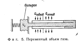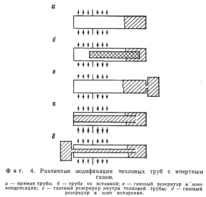 ПРАКТИЧЕСКАЯ КОНСТРУКЦИЯ САМОРЕГУЛИРУЮЩИЕСЯ ТЕПЛОВЫЕ ТРУБЫРассмотрим конструкции тепловых труб, используемых в качестве саморегулирующихся устройств. Простейшая геометрия таких тепловых труб — прямая труба (фиг. 4, а). Газ собирается у конца трубы в зоне конденсации. Данная конструкция часто использовалась и ранее, однако возможности регулирования в этой схеме ограничены, поскольку имеющийся газовый объем мал, а площадь поперечного сечения парового канала относительно велика. Внутренняя вставка уменьшает площадь парового канала (фиг. 4, б), отношение V0/An увеличивается, что приводит к увеличению способности регулирования. Другой способ улучшения чувствительности заключается в присоединении к конденсатору газового резервуара большого объема. В этом случае непосредственно увеличивается отношение V0/An (фиг. 4, в). Недостаток указанных выше конструкций заключается в зависимости температуры газа от окружающей среды (холодный источник при температуре Т0). Изменения температуры газа всегда неблагоприятно действуют на регулирующую способность. Указанный недостаток устраняется при использовании схем, представленных на фиг. 4, гид. Газовый резервуар может размещаться внутри тепловой трубы (фиг. 4,в); при этом температура газа остается по существу постоянной. В другой схеме (фиг. 4, д) большой резервуар располагается рядом с испарительным концом тепловой трубы. Такая геометрия сочетает преимущества большого резервуара с нечувствительностью к изменениям температуры окружающей среды. ![]() ![]() Изменяемый газовый объем. В предыдущих примерах газ заключался в неизменном объеме. Повысить способность регулирования можно, если позволить объему самоустанавливаться, что достигается применением силфона (фиг. 5). Это вытекает из следующего выражения: ![]() РЕГУЛИРУЕМЫЕ ТЕПЛОВЫЕ ТРУБЫ Для изменения и регулирования температуры пара Тп в принципе может использоваться любая из переменных Q, Т0, тГ, ТТ и Vr. Тепловой поток Q и температуру холодного источника рассматривают в качестве основных переменных. Зависимость Тп от этих переменных представляет собой рабочую характеристику трубы. При независимом изменении пгг, Тг и Vr можно достигнуть желаемого наклона этой характеристики; он может быть отрицательным, что делает трубу подобной активному элементу в эквивалентной электрической цепи. |