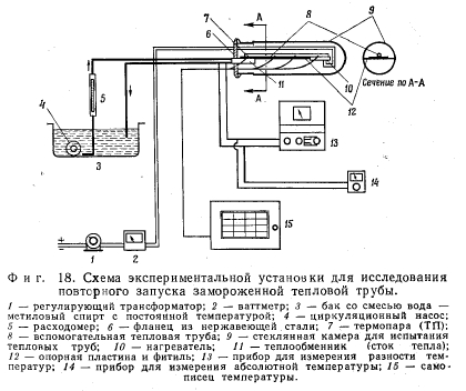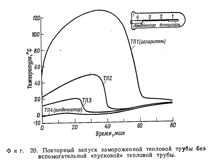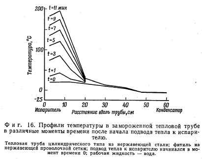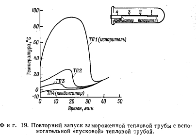 ПРОБЛЕМА ЗАМОРАЖИВАНИЯ ТЕПЛОВОЙ ТРУБЫДля выбранной рабочей жидкости рабочий диапазон тепловой трубы ограничен полосой между точкой замерзания жидкости и ее критической температурой. В большинстве тепловых труб диапазон рабочих температур лежит значительно ниже критической температуры. В то же время возможность замерзания рабочей жидкости в тепловой трубе представляет вполне реальную проблему. При проектировании тепловой трубы, безусловно, желательно выбрать такую рабочую жидкость, у которой точка замерзания была бы заведомо ниже предполагаемой рабочей температуры. Однако может оказаться, что это требование все же будет трудно удовлетворить. Если говорить о применении тепловых труб в космическом скафандре, то выбор рабочей жидкости (воды) диктуется как соображениями безопасности, так и достижимыми эксплуатационными характеристиками. В других случаях, даже если требования безопасности будут менее жесткими, стремление обеспечить высокую тепловую эффективность устройства может склонить чашу весов в пользу рабочей жидкости, точка замерзания которой будет выше минимальной возможной рабочей температуры. Эффективными рабочими жидкостями будут те, которые сочетают высокую теплоту испарения, высокие поверхностное натяжение и плотность с низкой вязкостью [12]. Оценка с этих позиций рабочих жидкостей для тепловых труб показывает, что металлы с /Низкой точкой плавления (натрий, калий и т. п.) и вода стоят во главе списка, тогда как аммиак, спирты и фреоны значительно менее эффективны, т. е. более эффективны- ми оказываются рабочие жидкости со сравнительно высокими значениями точки замерзания. Рабочая температура в тепловой трубе зависит от плотности подводимого и отводимого тепловых потоков. В стационарных условиях количество подводимого тепла должно быть равно количеству отводимого тепла. Температура пара в большинстве тепловых труб приблизительно постоянна. Величина подводимого и отводимого тепловых потоков зависит от термических сопротивлений между источником тепла и паром и соответственно между паром и стоком тепла. Эти сопротивления практически постоянны. Поэтому тепловые потоки и температура пара будут изменяться при изменении температуры стока и (или) температуры источника тепла. Тепловая труба может работать при температуре, лежащей между сравнительно высокой температурой источника тепла и температурой стока тепла, которая ниже температуры замерзания рабочей жидкости. При этом рабочая температура трубы за счет подвода тепла от источника будет поддерживаться на уровне, заметно превышающем точку замерзания. Роль источников тепла могут выполнять элементы оборудования, выделяющие тепло, температура которых регулируется тепловой трубой; выделяемое тепло отводится в космическое пространство излучением. Если оборудование будет временно отключено, то его температура понизится, к тепловой трубе перестанет поступать тепло и ее температура приблизится к температуре стока тепла. Рабочая жидкость в этом случае замерзнет, и передача тепла в процессе ее испарения-конденсации прекратится. Последнее обстоятельство само по себе не вызывает неприятностей, поскольку в оборудовании совсем не выделяется тепла. Более того, замерзание рабочей жидкости фактически предотвратит чрезмерное понижение температу
