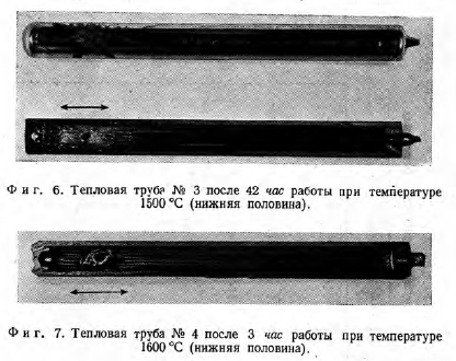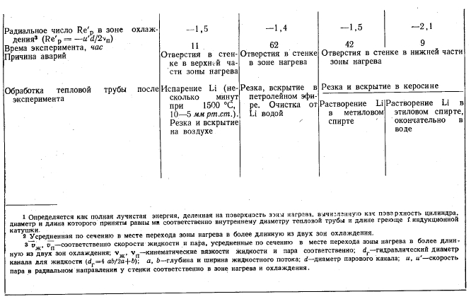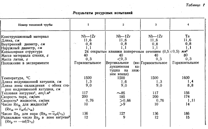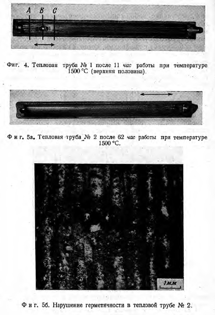 РЕСУРСНЫЕ ИСПЫТАНИЯДля проведения ресурсных испытаний тепловые трубы помещаются в трубы из кварцевого стекла, которые запаиваются пропано-кислородной горелкой (после отжига в течение 10 час при температуре 400 °С в вакууме 10~ь мм pm. cm. и нагревания тепловой трубы в течение нескольких минут до запланированной в эксперименте температуры). На фиг. 2 представлена впаянная в кварцевую оболочку тепловая труба. Она центрируется с помощью вольфрамовых штырей, укрепленных на опорах из Та. Подвижная шторка из тантала обеспечивает чистоту части поверхности кварцевой трубы, используемой для пирометрических температурных измерений. ![]() ![]() ![]() Необходимо было выяснить, может ли газопроницаемость кварцевой трубки привести к существенному загрязнению тепловых труб в процессе испытания. В связи с этим температура кварцевого стекла измерялась термочувствительными красками. Было обнаружено, что для тепловой трубы из Та, работающей при температуре 1600 °С, максимально допустимая температура кварцевого стекла должна лежать между 500 и 600 °С. В соответствии с работой 17] при этой температуре проницаемость плавленого кварца для кислорода не превышает 10~п (норм.) см3-мм/сек-см2-мм рт. ст. Из этого следует, что в течение 100 час тепловая труба сможет поглотить не более 1 ч. на млн. кислорода (аналогично и для азота). ![]() ![]() На фиг. 3 показана тепловая труба, установленная на стенде для ресурсных испытаний. Нагревание осуществляется относительно короткой индукционной катушкой. Выключение высокочастотного генератора в случае аварии тепловой трубы обеспечивается при помощи двух фотоэлементов, измеряющих излучение из зон нагрева и охлаждения. Разность их сигналов регистрируется автоматическим милливольтметром, имеющим контакты «макс» и «мин» и производящим выключение генератора. В табл. 1 представлены результаты ресурсных испытаний четырех тепловых труб, которые были изготовлены из сплава Nb — IZr (две различные поставки) и Та. Подобно ранее проведенным экспериментам [5], все тепловые трубы выходили из строя после нескольких часов работы за счет прогара стенки в зоне нагрева. После эксперимента тепловые трубы были вскрыты и Li удален (см. последнюю строку табл. 1). На фиг. 4— 7 представлены четыре тепловые трубы на этой стадии исследования (стрелками показано положение индукционной катушки). Тепловые трубы были затем разрезаны и проанализированы. |