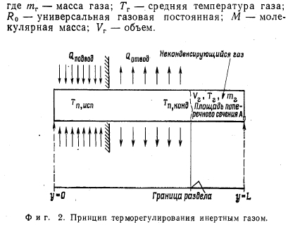 ТЕПЛОВЫЕ ТРУБЫ С НЕКОНДЕНСИРУЮЩИМСЯ ГАЗОМ ПРИНЦИП ДЕЙСТВИЯНеконденсирующийся газ, вводимый в тепловую трубу, вытесняется потоком пара в зону конденсации. Будучи неконденсирующимся, он не участвует в циркуляции и скапливается в зоне конденсации. При определенных условиях между циркулирующим паром и застойным газом устанавливается относительно резкая граница раздела (фиг. 2). В той части поверхности конденсатора, которая соприкасается с газом, теплоотвод практически отсутствует; таким образом, перемещая границу раздела, можно изменять поверхность теплоотдачи. Положение границы раздела определяется из условия равенства давлений пара и газа ![]() Регулирование может быть осуществлено изменением давления как пара, так и газа. Поскольку газ приближенно подчиняется уравнению состояния идеального газа, его давление дается выражением ![]() ![]() В качестве параметров для регулирования положения границы раздела, а следовательно, и термического сопротивления тепловой трубы в принципе могут быть использованы температура, объем и масса газа. |