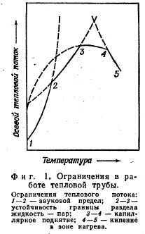ВВЕДЕНИЕТепловая труба, в которой используется капиллярный напор для перемещения рабочей жидкости, а тепло переносится потоком пара, обеспечивает перенес значительных количеств тепла. Хотя размеры и ферма системы на практике довольно произвольны, ее работу лучше всего рассмотреть на примере простой цилиндрической конструкции, состоящей из закрытой на торцах трубы, внутри которой размещен фитиль из тонкой сетки. Жидкая фаза рабочей жидкости и паровая фаза могут свободно перемещаться в своей зоне; в то же время происходит непрерывное взаимодействие между поверхностью жидкости и паром на всей длине трубы. На одном конце труба подвергается нагреву, а на другом — охлаждению. В этих условиях устанавливается противоточная циркуляция пара и жидкости, сопровождаемая испарением или конденсацией рабочей среды на поверхности раздела фаз. Однако из-зоны нагрева поступает результирующий поток пара. Некоторый избыточный поток пара поступает в зону охлаждения и конденсируется на фитиле, выделяя при этом скрытую теплоту испарения. Тепло отводится в окружающую среду через фитиль, насыщенный жидкостью, и стенку трубы, конденсат же поглощается фитилем и возвращается в зону нагрева. Тепловая труба обладает многими преимуществами как система с очень высокой теплопроводностью [1, 2] однако она имеет ряд ограничений, связанных с достижением паровым потоком звуковой скорости, со срывом жидкости потоком пара, с капиллярным напором и кипением в насыщенном фитиле [3, 4]. Влияние этих ограничений на теплспередающие возможности тепловой трубы с жидкометаллическим рабочим телом показано на фиг. 1. Ограничение, по скорости звука (кривая 1—2) не зависит от конструкции фитиля, в то время как другие ограничения существенно зависят от его конструкции [5, 6]. ![]() В настоящей работе изучены ограничения по скорости звука для натрия, калия и цезия, для того чтобы показать зависимость этих предельных характеристик от рабочей температуры и свойств рабочей жидкости. Так как тепловые трубы работают обычно в практически изотермичных условиях, особое внимание было обращено на довольно высокие температурные градиенты, которые возникают, когда поток достигает скорости звука. Ограничения по капиллярному напору, обнаруженные в предыдущих работах [5, 6], были преодолены за счет использования конструкции тепловой трубы, включающей два цилиндра. Внутренний цилиндр, имеющий очень маленькие отверстия (поры), служит каналом для прохода пара, а кольцевой зазор между внутренним пористым цилиндром и внешней трубой (контейнером) — для возврата жидкости. Было показано, что если кольцевой зазор полностью заполнен жидкостью и закрыт с обоих торцов, то капиллярный напор зависит от размера пор внутренней трубы. |