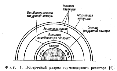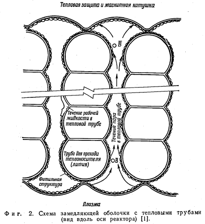 ВВЕДЕНИЕВ последние годы тепловые трубы привлекли к себе пристальнее внимание. Их намериваются использовать во многих теплоебменных установках, в том числе в ряде перспективных энергетических установок. Данная работа посвящена исследованию характеристик тепловых труб при наличии магнитного поля. Оно было проведено в связи с предполагаемым использованием тепловых труб в одном из вариантов энергетической установки с управляемым термоядерным реактором [11. Предполагается, что в управляемом термоядерном реакторе горячая плазма внутри вакуумной камеры будет удерживаться от контакта со стенками камеры с помощью сильных магнитных полей (фиг. 1). Известно, чтр значительная часть выделяемой в результате термоядерного синтеза энергии приходится на нейтроны больших энергий. Кинетическая энергия этих нейтронов превращается в тепловую в замедлителе —«оболочке» из жидкого литья, расположенной снаружи вакуумной камеры с плазмой. В результате столкновений с ядрами лития движение нейтронов замедляется, при этом их энергия передается литию. Литий по трубам перекачивается в парогенератор, где получают пар высоких параметров, служащий рабочим телом паросиловой установки. ![]() К сожалению, выделение энергии нейтронами в литиевой оболочке происходит крайне неравномерно. Плотность выделения энергии с ростом радиуса фактически падает примерно по экспоненте. Для того чтобы «сгладить» этот неблагоприятный профиль плотности выделяемой энергии, Вернер предложил использовать тепловые трубы, объединенные в одно целое со специально спроектированной вакуумной камерой [1]. На фиг. 2 изображена принципиальная схема предлагаемой конструкции. Сверхпроводящие обмотки магнита, используемого для получения магнитных полей большой напряженности, должны располагаться за пределами зоны интенсивного потока нейтронов, т. е. снаружи литиевой оболочки. Это в свою очередь означает, что тепловые трубы будут находиться в магнитном поле. Из исследований магнитных расходомеров и МГД-генераторов известно, что при течении электропроводных жидкостей в магнитном поле возникают дополнительные потери давления, поэтому было проведено специальное исследование по влиянию магнитных эффектов на характеристики тепловых труб. Тепловая защита и магнитная катушка ![]() В следующих разделах настоящей работы прежде всего проанализировано влияние магнитного поля на течение жидкой фазы в фитиле. Показано, что влияние магнитного поля на характеристики тепловой трубы проявляется наиболее сильно в том случае, когда составляющая магнитного поля перпендикулярна оси трубы, рабочая жидкость электропроводна и фитиль выполнен из металла. В этих условиях влияние магнитного поля проявляется через три основных механизма, каждый из которых обусловливает увеличение потерь давления при течении жидкой фазы. 1. В жидкости в плоскости, перпендикулярной направлению течения, возникают вихревые электрические токи, что ведет к утонению пристеночных пограничных слоев (профиль скорости в канале становится более «плоским») 2. Величина указанных в п. 1 электрических токов возрастает, если стенки фитиля электрспроводны, что обусловливает появление в жидкости объемных магнитных сил, тормозящих ее движение. 3. Вихревые электрические токи возникают и в «концевых областях», где жидко