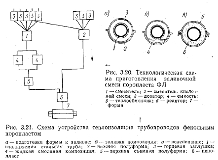 Бесканальные теплопроводы с изоляцией из фенольного поропластаК конструкции бесканального теплопровода с монолитной изоляцией относится теплопровод с оболочкой из фенольного поропласта. Слой изоляции накладывают способом заливки формы. Изоляция из поропласта обладает, как и пенобетон, свойством адгезии. При этом совместное температурное перемещение изоляции с трубой не вызывает ее разрушения вследствие того, что усилие трения между изоляцией и грунтом меньше усилий, необходимых для нарушения сцепления монолитной теплоизоляции со стальной поверхностью трубы. Фенольные поропласты получают путем вспенивания ком позиции феаол формальдегидных смол с введением газообразователя, отвердителя и пластификатора. В зависимости от вида применяемых смол их подразделяют на фенольные поропласты новолачного и резольного типов. Первые (марки ФФ, ФК, ФС) отверждаются при нагреве и давлении, вторые (марок ФРП, ФЛ, Б) —в естественных условиях. Фенольные поропласты в настоящее время являются наиболее доступными и относительно недорогими. По своим физико-механическим свойствам они в основном удовлетворяют требованиям, предъявляемым к теплоизоляционным материалам для тепловых сетей. Работы по применению ячеистых пластмасс как изоляционных материалов в конструкциях бесканальной прокладки тепловых сетей были начаты в 1962 г. А. Н. Крашенинниковым в Ленинградском зональном институте экспериментального проектирования (ЛенЗНИИЭП). В результате разработана конструкция монолитной изоляции и технология ее изготовления из фенольного поропласта марки ФЛ, получаемого на базе фенол форм альдегидной смолы марки ВИАМ-Б с добавлением газообразователей и отвердителя. Разработаны составы, технология и регламенты промышленното производства монолитной теплоизоляции труб с применением фенольного поропласта ФЛ. Фенольные поропласты ФЛ-1, ФЛ-2 и ФЛ-3, разработанные в ЛенЗНИИЭП, могут быть получены с объемной массой от 40 до 200 кг/м3 и выше, а это значит, что в зависимости от условий эксплуатации они могут выполнять не только теплоизоляционные функции, но и одновременно воспринимать значительные нагрузки. Все материалы, необходимые для получения поропластов ФЛ, освоены отечественной промышленностью и не являются дефицитными. Технологическое оборудование для получения поропластов и изготовления теплоизоляционной конструкции теплопроводов с их использованием несложно, а поэтому организация производства изолированных труб является вполне доступной даже для маломощных строительных организаций. Поропласты ФЛ-1, ФЛ-2 и ФЛ-3 получают путем вспенивания вязкожидкой смоляной композиции водородом, выделяющимся в результате взаимодействия металлического порошка с минеральной кислотой, с одновременным отверждением смолы кислым катализатором. Поропласт ФЛ-1 изготовляется с применением соляной кислоты, в связи с чем имеет кислую реакцию. В поропластах ФЛ-2 и ФЛ-3 соляная кислота заменена на ортофосфорную, продукты которой при реакции с металлическими соединениями создают на поверхности трубы защитную антикоррозионную пленку. Поропласт ФЛ-1, полученный на основе спирторастворимой резольной фенолформальдегидной смолы ВИАМ-Б и каталитической смеси (соляная кислота и контакт Петрова), обладает некоторой коррозионной активностью за счет выделения х