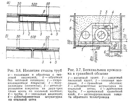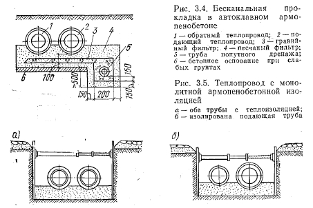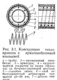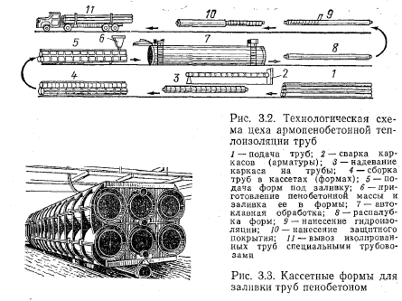 Бесканальные теплопроводы в автоклавном армопенобетонеВ настоящее время все большее развитие получают индустриальные способы строительства тепловых сетей с различными видами монолитной тепловой изоляции. Монолитная тепловая изоляция бесканальных теплопроводов представляет собой прочную неразрушающуюся оболочку, нанесенную на трубы в заводских или полигонных условиях, надежно защищающую теплопроводы от тепловых потерь. Эта изоляция должна выдерживать механические нагрузки, связанные с транспортировкой и монтажом тепловых сетей. ![]() В Ленинграде и других городах широко применяется бесканальная прокладка тепловых сетей с монолитной армопенобетонной тепловой изоляцией (заводского изготовления), которая была предложена А. Н. Крашенинниковым и П. А. Лазаревым. Этот вид тепловой изоляции явился первой отечественной индустриальной конструкцией для подземной канальной и бесканальной прокладки, наносимой на трубы в заводских условиях. Конструкция изоляции (рис. 3. 1) представляет собой нанесенную на трубы в заводских условиях армопенобетонную оболочку с автоклавной термообработкой и последующей оклейкой в 2—3 слоя рулонными битумными материалами. Защитный слой в виде асбестоцементной штукатурки, армированной металлической сеткой, предохраняет оклеенную гидроизоляцию от механических повреждений. Теплоизоляционный слой из армопенобетона обладает следующими теплофизическими свойствами: ![]() Так как автоклавный пенобетон является хрупким материалом и имеет прочность, недостаточную для выдерживания механических нагрузок, связанных с транспортированием труб на строительные объекты и их монтажом, пенобетон армируют спиральным арматурным каркасом. Арматурные каркасы готовят из продольных стержней диаметром 6 мм, обкатываемых по спирали проволокой-катанкой диаметром 3—4 мм на специальных сварочных станках-автоматах. Трубы армируют двумя полукаркасами, соединяемыми между собой в средней части трубы. Расстояние между каркасом и наружной поверхностью тепловой изоляции около 25 мм. Для изготовления автоклавного пенобетона применяют следующие материалы: портландцемент марки не ниже 400, молотый кварцевый песок или маршалит (пылевидный кварц) с содержанием кремнезема не менее 80 %, известь, пенообразователь и воду. В качестве пенообразователя используют состав, приготовленный на основе столярного или мездрового клея, канифоли, кальцинированной соды и воды. Технологическая схема изоляции труб пенобетоном (рис. 3.2) состоит из следующих операций: приготовления пенобетонной смеси; вязки арматурных металлических каркасов; очистки труб от грязи и ржавчины; армирования и установки их в формы-кассеты; заливки форм пеномассой и выдержки пенобетона до автоклавной обработки; обработки в автоклавах, распалубки и сушки изолированных труб- устройства гидроизоляции и нанесения защитного слоя. Технология приготовления пенобетонной смеси следующая. Песок из приемного бункера через питатель поступает в приемную воронку стержневой мельницы мокрого помола. Туда же подается вода и известыв количестве 1 —1,5% массы песка. Из мельницы песочный шлам с помощью камерного насоса подается в шламобассейн, расположенный над дозатором пенобетоносмесителя. Одновременно с подачей в пенобетоносмеситель песочного шлама поступают через д