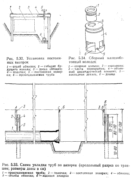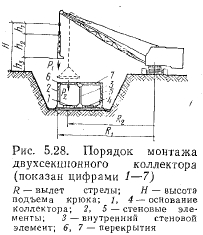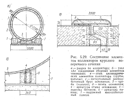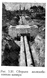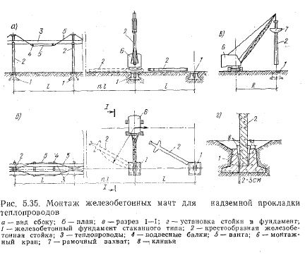 Монтаж строительных конструкций и сооруженийСтроительство тепловых сетей связано не только с монтажом самих трубопроводов, но и с сооружением целого ряда строительных конструкций. К ним относятся каналы, коллекторы, камеры, колодцы, опоры, эстакады, дренажи, мачты для прокладки надземных теплопроводов и другие конструкции. С целью индустриализации строительства большинство упомянутых конструкций выполняется в сборном виде. Каналы. Для всех каналов независимо от их формы и поперечных размеров существует требование: днище (монолитное или сборное железобетонное) следует укладывать на уплотненную песчаную или щебеночную подготовку слоем не менее 10 см, которая в свою очередь делается по спланированному по нивелиру дну траншеи. При слабых грунтах проводят мероприятия по укреплению основания. Для всех каналов принят единый порядок монтажа сборных железобетонных конструкций- вначале укладывают нижний элемент—плиту основания, нижний лоток, а стеновые элементы и перекрытия монтируют после окончания монтажа, изоляции и испытания трубопроводов. Исключение составляют общие (проходные) коллекторы, коллекторы из объемных элементов и круглого поперечного сечения. Еще сравнительно недавно стены каналов выкладывали из хорошо обожженного кирпича (пережога), а днища делали монолитными. В настоящее время стены непроходных и проходных каналов, днища и перекрытия делают из сборных железобетонных плоских плит, а также из лотковых и сводчатых элементов. Эти элементы имеют относительно малую массу по сравнению с трубопроводами и монтаж их ведут обычно теми же кранами, что и теплопроводы. Однако во всех случаях производят проверку монтажного крана по его грузоподъемности (см. § 5.3 «Выбор крана»). В трубопроводном строительстве принимают следующую схему ведения монтажа: отвал грунта размещают с одной стороны траншеи, а с противоположной располагают монтажную площадку, по которой движется (вдоль траншеи) монтажный кран и раскладываются сборные элементы каналов и камер. Согласно СНиП III-4-80 перемещение, установка и работа машин вблизи выемок (котлованов, траншей, канав и т. п.) с неукрепленными откосами разрешается только за пределами призмы обрушения грунта на расстоянии, установленном проектом производства работ. При отсутствии соответствующих указаний в проекте производства работ допустимое расстояние по горизонтали от основания откоса выемки до ближайших опор машин следует принимать по данным табл. 5.3. Раскладку сборных элементов производят не ближе 0,5 —1 м от бровки. Таблица 5.3. Расстояния по горизонтали от основания откоса выемки до ближайшей опоры машины ![]() В проектное положение плиты основания укладывают монтажным краном при помощи четырехветвевого стропа («паука»), крюки которого зацепляют за монтажные петли, расположенные у углов плиты. Укладку ведут по выровненному основанию, строго соблюдая проектный уклон, который контролируют нивелиром. Стыки плит оснований заполняют цементным раствором. Плиты стеновых элементов имеют на торце большей стороны монтажные петли, за которые зацепляют крюками двухветвевого стропа. Стеновые элементы устанавливают на цементный раствор, разостланный по краям плит основания (см. рис. 2.26) или на цементный раствор, уложенный в паз, если плита имеет таковой (см. рис. 2.28). В обоих случаях стен