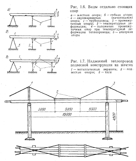 Надземная прокладка теплопроводовНадземную прокладку тепловых сетей применяют на территориях промышленных предприятий, на площадках, свободных от застроек, вне пределов города или в местах, где она не влияет на архитектурное оформление и не мешает движению транспорта. Надземная прокладка имеет ряд преимуществ: доступность для осмотра и удобство эксплуатации; возможность в кратчайшие сроки обнаружить и ликвидировать аварию в теплопроводах; отсутствие электрокоррозии от блуждающих токов и коррозии от агрессивных грунтовых вод; меньшая стоимость сооружения по сравнению со стоимостью подземных прокладок тепловых сетей. Надземную прокладку тепловых сетей осуществляют: на отдельно стоящих опор ах (мачтах); на эстакадах с пролетным строением в виде прогонов, ферм или подвесных (вантовых) конструкций; по стенам зданий. ![]() Низкие опоры применяют в основном для надземной прокладки тепловых сетей на свободных от застроек площадках. При прокладке на низких опорах расстояние в свету от поверхности земли до низа тепловой изоляции теплопроводов должно быть не менее 0,35 м. Высокие отдельно стоящие опоры подразделяют на жесткие, гибкие и качающиеся (рис. 1.6). Жесткие опоры представляют собой отдельные колонны или рамы. Гибкие опоры — это стальные стойки, жесткозаделанные в фундамент с трубопроводом и при температурном удлинении последнего перемещается совместно с трубой. Перемещение верхушки происходит за счет упругого изгиба стойки. Качающиеся высокие опоры состоят из стальной или железобетонной стойки, шарнирно соединенной с фундаментом. Верхушка стоек шарнирно соединяется с опирающимся трубопроводом и за счет поворота стойки вокруг нижнего шарнира может свободно перемещаться в горизонтальном направлении при перемещении трубопроводов вследствие изменения температуры. Высоту мачт определяют исходя из заданных габаритов для проездов. Мачту рассчитывают на массу пролета труб, горизонтальные осевые и боковые усилия, возникающие от трения теплопроводов на подвижных опорах, а также на ветровую нагрузку. При прокладке труб небольшого диаметра на отдельных опорах, промежуточные опоры создают посредством вантовых растяжек и подвесок (рис. 1.7). Отдельно стоящие мачты или опоры выполняют из дерева, стали или железобетона. Деревянные мачты дешевле других, но они недолговечны и применяются для временных прокладок тепловых сетей. При небольших объемах строительства надземных тепловых сетей применяют стальные мачты из профильной стали, однако они дороги и трудоемки И поэтому вытесняются железобетонными. Мачты из железобетона особенно целесообразно применять при массовом строительстве тепловых сетей на промышленных площадках, когда рентабельно организовать их изготовление в заводских условиях. Для совместной прокладки тепловых сетей с другими трубопроводами различного назначения применяют эстакады, изготовляемые из металла или железобетона. В зависимости от количества одновременно прокладываемых трубопроводов пролетные строения эстакад могут быть одноярусными или многоярусными. Примеры размещения трубопроводов на эстакадах показаны на рис. 1.8. Теплопроводы обычно прокладывают на нижнем ярусе эстакады, при этом трубопроводы с более высокой температурой теплоносителя размещают ближе к краю, обеспечивая тем сам