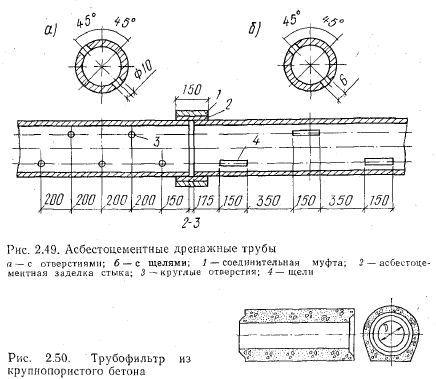 Попутный дренажОдним из основных условий повышения долговечности и надежности подземных тепловых сетей является защита их от затопления грунтовыми или поверхностными водами. Затопление сетей приводит к разрушению изоляции, развитию наружной коррозии трубопроводов, а также к резкому увеличению тепловых потерь. Поэтому при строительстве подземные тепловые сети желательно располагать выше уровня грунтовых вод. Если же практически это не осуществимо, то при прокладке тепловых сетей ниже максимального уровня стояния грунтовых вод следует предусматривать искусственное понижение грунтовых под — попутный дренаж, а для наружных поверхностей строительных конструкций — обмазочную битумную изоляцию. Для защиты подземных тепловых сетей от поверхностных вод в первую очередь необходима планировка поверхности земли над теплопроводами. В результате этой планировки отметки поверхности земли над теплопроводом должны несколько превышать отметки окружающего грунта. Желательно устройство над тепловыми сетями уличной одежды в виде бетонного или асфальтобетонного покрытия. В отдельных случаях при затруднениях с организацией отвода поверхностных вод в местах понижения рельефа по трассе на таких участках также возникает необходимость сооружения дренажных устройств. Строительству дренажа предшествуют изыскательские и проектные работы с выявлением гидрогеологических условий района. Производят съемку местности, составляют гидрогеологические профили с установлением уровня грунтовых вод, подсчитывают дебит воды, поступающей на участок теплотрассы, определяют место отвода этой воды, составляют депрессионные кривые понижения уровня грунтовых вод дренами и определяют требуемые расстояния и диаметр дрен. Вычерчивают план и продольный профиль закладки дренажа. Для тепловых сетей, как правило, применяются горизонтальные дренажи. При невысоком уровне грунтовых вод и небольшом дебите применяют упрощенную конструкцию в виде дренирующего основания под каналом из крупного песка или гравия (рис. 2.48,а). Дренажные устройства (рис. 48,6) прокладывают вдоль трассы тепловых сетей по одну (односторонние дренажи) или обе стороны (двусторонние дренажи) от нее. Односторонние дренажи располагают со стороны притока грунтовых вод. Основное требование к дренажу в зоне прокладки тепловых сетей заключается в том, чтобы кривая депрессии (уровень грунтовых вод при работе дренажа) была ниже дна канала или нижней отметки изоляционной конструкции теплопровода при бесканальной прокладке. Для этого заглубление верха дренажных труб принимают не менее 300 мм от дна канала, а при бесканальной прокладке — не менее 300 мм от нижней поверхности изоляции теплопроводов. Выбор конструкции дренажа зависит от условий прокладки теплосетей: уровня и направления движения грунтовых вод, их дебита, уклона трассы тепловых сетей, характера строения грунта и др. Для попутного дренажа в основном применяют асбестоцементные трубы с муфтами, керамические канализационные раструбные трубы, а также готовые трубофильтры. Применяют также бетонные, железобетонные, пластмассовые и другие трубы. Однако бетонные и железобетонные трубы можно использовать только для неагрессивных вод, так как в противном случае бетон может выщелачиваться с разрушением. Асбестоцементные безн