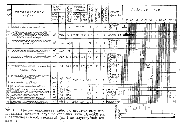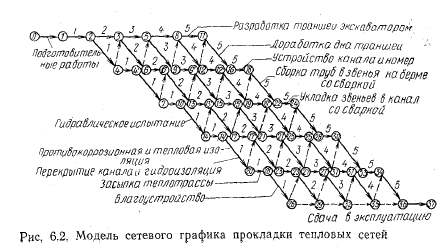 Проект производства работПоследовательность, увязка между собой и продолжительность выполнения работ по сооружению тепловых сетей принимается в соответствии с проектом производства работ (ППР). Он является также руководящим материалом для текущего планирования и оперативного руководства строительством тепловых сетей, а также для контроля и учета строительного производства. ППР составляют на основе ПОС по рабочим чертежам на строительство новых или реконструкцию и расширение действующих тепловых сетей, а также на выполнение отдельных видов строительно-монтажных работ и работы подготовительного периода. ППР разрабатывает генеральная подрядная строительная организация вместе с субподрядными строительно-монтажными и специализированными организациями на основе решений, принятых в ПОС с учетом плана;организационно-технических мероприятий строительно-монтажных организаций. Строительство тепловых сетей без утвержденных в установленном порядке ППР запрещается. Затраты, связанные с разработкой ППР, а также с привязкой проектов к местным условиям, осуществляются каждой строительной организацией за счет ее накладных расходов. Проектные организации разрабатывают ППР как исключение в тех случаях, когда имеются заказы строительно-монтажных организаций. Эти работы выполняются на основе договоров, причем разработка осуществляется, как правило, непосредственно на строительных площадках. При особой сложности схемы участков теплопроводов (например, воздушных мостовых переходов или подводных через реки), сложности условий производства работ и в случае применения новых конструкций или строительных материалов, по решению организации, утвердившей технорабочий (технический) проект, разработку ППР выполняет проектная организация за счет средств на проектирование. Для разработки ППР необходимы следующие исходные данные: сводная смета; проект организации строительства; рабочие чертежи; задание на разработку ППР (сведения об объеме и сроках строительства); сведения о сроках и порядке поставок готовых конструкций, материалов, даталей и оборудования, о наличии технических средств, кадров и др. ППР на строительство тепловых сетей должен содержать: 1) календарный план (график) производства работ или сетевой график по объектам с указанием последовательности и сроков выполнения строительно-монтажных работ в целом. Пример календарного графика на строительство бесканальных тепловых сетей с битумоперлитной изоляцией показан на рис. 6. 1. : ![]() Следует отметить, что Сетевые графики не находят широкого применения на строительстве линейной части трубопроводов, в частности, тепловых сетей (за исключением строительства подводных и воздушных переходов через крупные водные преграды), прежде всего потому, что набор работ здесь небольшой (примерно от 10 до 20 наименований). Пример сетевого графика на прокладку тепловых сетей приведен на рис. 6.2. Сетевые графики, на наш взгляд, целесообразно применять для строительства крупных комплексов, включающих большое количество видов строительно-монтажных и специальных работ, в том числе и по строительству тепловых сетей, когда может потребоваться оптимизация графиков, особенно при наличии автоматизированных систем управления строительством с применением ЭВМ. Кроме того, традиционные кале