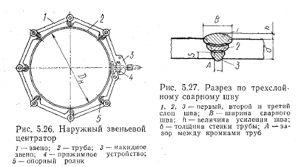 Сварочные работыСварка как неразъемное соединение стальных труб получила очень широкое распространение в строительстве тепловых и других сетей. В трубопроводном строительстве используют электродуговую автоматическую, полуавтоматическую и ручную сварку труб. Реже применяют контактную сварку. Газовую сварку используют для труб малых диаметров (с небольшой толщиной стенки труб), Вместе с тем газ широко используют для резки труб. Подготовка кромок труб к сварке. Перед сборкой стыка необходимо выполнить следующее: очистить внутреннюю и внешнюю поверхность труб от грунта и других загрязнений; выправить и в случае необходимости обрезать кромки деформированных концов труб; очистить до металлического блеска (при дуговой сварке) кромки и прилегающие к ним внутреннюю и наружную поверхности на ширину не менее 10 мм. Форма кромок труб для сварки, углы скоса и величина притупления, показанные на рис. 5.25, должны соответствовать табл. 5.2. Ручную дуговую сварку труб со стенками толщиной до 4 мм и автоматическую сварку труб со стенками толщиной до 6 мм включительно производят без скоса кромок. Смещение кромок Р (см. рис. 5.25) на участке, не превышающем четверти длины окружности трубы, не должно превышать 20% толщины стенки трубы 8 и быть не более 3 мм. Величину зазора А устанавливают по СНиП Ш-29-76 §2.11 и ГОСТ 16037—80. Сборку стыка осуществляют с помощью центраторов, которыми совмещают концы труб. ![]() Центраторы бывают наружные и внутренние. Наружный центратор состоит из отдельных звеньев, шарнирно соединенных между собой подобно ролико-втулочной цепи (рис. 5.26). Звенья имеют выступы, в которых укреплены втулки с роликами. Крайнее звено имеет замок с запорнонатяжным устройством. Стыкуемые донцы труб, очищенные от грязи и ржавчины, сближают между собой так, чтобы получить необходимый зазор между кромками. На будущий стык накладывают центратор, причем ролики его заходят на равные расстояния как на одну, так и на другую трубу. Затем центратор смыкают в замке и с помощью рычага вращают винт, упирающийся, в башмак, который в свою очередь опирается на трубу. При натяжении ролики центратора плотно прижимаются к обоим концам труб. Звеньевые центраторы применяют для труб, большого диаметра. Для малых диаметров труб примеряют наружные эксцентрированные центраторы. Натяжение таких центраторов осуществляется при помощи эксцентрикового замка путем поворота рукоятки. Эксцентриковые наружные центраторы применяют для сборки стыков труб диаметром 150—400 мм. Внутренние центраторы в отличие от наружных вводят внутрь труб под будущий стык. Применяют их для труб больших диаметров на строительстве магистральных трубой проводов. После сборки стыка под дуговую сварку делают прихватки путем наложения коротких сварочных швов. Длина шва каждой прихватки 30—40 мм для поворотных стыков и 50—60 мм для неповоротных. Прихватки делают теми же электродами и при тех же режимах сварки, которые будут применены при сварке стыка. Высота прихватки должна составлять 40—50% толщины стенок труб. Количество прихваток по длине окружности в зависимости от диаметра труб должно быть: при диаметре труб d 200 мм число прихваток п = 2; при d=250—350 мм п = 3 м; при d = 400—500 мм п = 4; при с/=600 мм п = 5—6; при d — = 700 мм п = 5—7; при d = 800—1400 мм п = 6—8. ![]() Электродуговая ручная сварка труб. Дуговую сварку поворотных и н