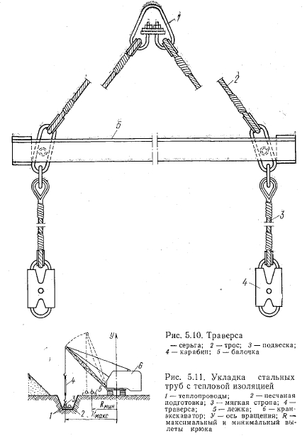 Укладка стальных теплопроводовВыбор метода укладки теплопроводов зависит от целого ряда условий. Главными из них являются: конструкция теплопроводов, вид прокладки (подземная, надземная), материал труб, тип изоляции и способ ее нанесения (заводской или на месте укладки). Разнообразие условий не позволяет рассмотреть все возможные случаи монтажа тепло- проводов. Ниже будут приведены примеры прокладок с характерными условиями, влияющими на способ монтажа, а именно способы подземной прокладки стальных теплопроводов: в каналах и коллекторах из труб с заводской изоляцией и с изоляцией на месте работ; бесканальная прокладка с заводской изоляцией труб. В трубопроводном строительстве и при монтаже теплопроводов, в частности, независимо от указанного выше способа прокладки широкое распространение получили самоходные стреловые краны на гусеничном и пневмоколесном ходу, а также тракторные краны (трубоукладчики). Самоходные стреловые краны обладают рядом преимуществ. К их достоинству относятся: большая подвижность, возможность перемещений груза в любом направлений на большие расстояния, мобильность (возможность легкой переброски кранов как внутри площадки, так и с одной строительной площадки на другую), возможность использования не только на монтажных, но и на других работах. Эти краны изготовляют в виде универсальных кранов-экскаваторов со сменным экскаваторным, крановым и другим оборудованием. Кроме того, выпускают специальные краны. Силовым оборудованием самоходных стреловых кранов являются обычно дизельные или карбюраторные двигатели, а также электродвигатели и дизельэлектрические системы. Краны используют как в городских условиях, так и в условиях бездорожья. Стреловые самоходные краны на автомобильном (пневмоколесном) ходу для устойчивости во время работ снабжают выносными опорами, называемыми аутриггерами. Достоинством этих кранов, является их мобильность. Используются они для строительства подземных тепловых сетей и сетевых сооружений обычно в городских условиях, а также для погрузочно-разгрузочных работ. Тракторные краны представляют собой трактора с укрепленными на них стрелами в виде навесного оборудования. Различают две основные разновидности таких кранов: навесные тракторные краны, у которых стрела является навесным оборудованием, и специальные краны-трубоукладчики (не имеющие сменного оборудования). Краны-трубоукладчики это специальные краны, предназначенные для укладки стальных и других трубопроводов. Горизонтальное перемещение груза производится трубоукладчиком за счет изменения вылета стрелы путем увеличения или уменьшения ее угла наклона. У трубоукладчика стрела размещается всегда слева по ходу его движения. Монтируются трубоукладчики на базе гусеничных тракторов ДТ-75, Т-130, Т-180 и др. Выбор монтажного крана. В зависимости от характера сооружения, величины его конструктивных элементов и принятого метода монтажа монтажный кран выбирают в два приема: вначале выбирают тип крана, а затем производят подбор по требующейся в данных условиях грузоподъемности. После этого проверяют возможность монтажа по высоте подъема крюка крана. Для строительства теплопроводов как линейной части, так и сооружений на ней наиболее подходящим типом крана является самоходный стреловой кран и кран-экскава
