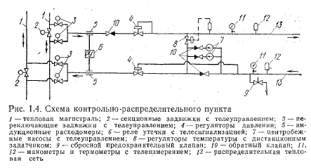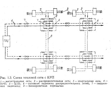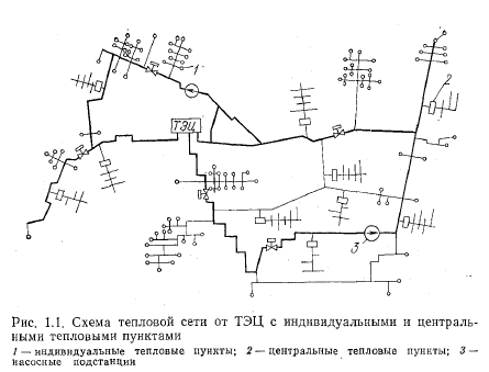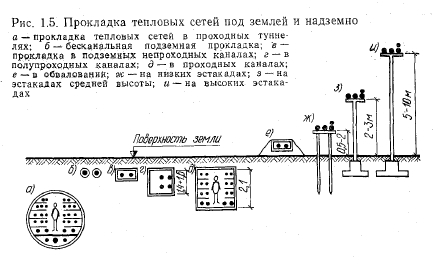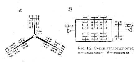 Устройство теплопроводовТепловые сети являются одним из наиболее трудоемких и дорогостоящих элементов систем теплоснабжения. Они представляют сложные сооружения, состоящие из соединенных между собой труб, тепловой изоляции, компенсаторов линейных температурных деформаций, подвижных и неподвижных опор, запорной и регулирующей арматуры, строительных конструкций, камер и колодцев, дренажных устройств. Первоочередной задачей проектирования тепловых сетей является выбор трассы, конструкций теплопроводов и способа прокладки. Проектное решение принимают на основании материалов гидрогеологических изысканий и съемки местности, перспективного развития системы теплоснабжения и очередности строительства тепловых сетей, а также технико-экономического сравнения отдельных возможных решений с учетом последних достижений науки и техники в этой области. Проектирование производят с учетом требований СНиП П-36-73 «Тепловые сети. Нормы проектирования». Водяные тепловые сети по назначению и диаметрам труб подразделяют на магистральные и распределительные. К магистральным сетям обычно относятся теплопроводы, соединяющие источники тепла с районами теплового потребления, а также соединяющие источники тепла (ТЭЦ или котельные) между собой. Общее направление трассы магистральных тепловых сетей следует принимать с учетом ее минимальной протяженности и прокладки в районах с наиболее плотной тепловой нагрузкой. Теплоноситель поступает из магистральных тепловых сетей в распределительные сети, по которым подается через центральные тепловые пункты или местные тепловые пункты (МТП) к теплопотребляющим установкам абонентов (рис. 1.1). Магистральные тепловые сети прокладывают из труб большого диаметра (400—1400 мм). Как правило, мелких ответвлений от магистральных тепловых сетей не делают, для этого используют распределительные сети, которые обычно имеют диаметр от 100 до 300 мм. Непосредственно к магистральным тепловым сетям допускается присоединение крупных промышленных предприятий. Диаметр труб ответвлений, ведущих к потребителям, в зависимости от величины тепловой нагрузки, колеблется от 50 до 150 мм и выше. Подразделение тепловых сетей на магистральные и распределительные является вполне четким и однозначным только в тех случаях, когда магистральные сети имеют более высокие расчетные параметры, чем принятые для при- соединенных к ним распределительных сетей. Другим признаком магистральных тепловых сетей является транзит тепла в них (т. е. транспортирование тепла без его попутного отпуска потребителям). Однако -оба эти признака в тепловых сетях выражены гораздо слабее, чем, например, в газовых или электрических сетях. ![]() Снижение параметров воды при переходе от магистральных тепловых сетей к распределительным требует сооружения специальных тепловых пунктов. Проведенными технико-экономическими исследованиями для жилых районов установлено, что оптимальным является отпуск тепла от центральных тепловых пунктов в пределах 10—50 МВт, что примерно соответствует сооружению одного теплового пункта на микрорайон. Такие микрорайонные тепловые пункты рассматриваются как граничные между магистральными и распределительными тепловыми сетями. Магистральные тепловые сети по конфигурации, особенностям расчета и эксплуатации могут бы
