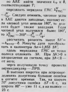 Определение места ВС и навигационных элементов полета в полярных районахПри полетах в центральной Арктике или над Антарктидой почти полностью исключается ориентировка ввиду отсутствия визуальных и равнолокацноииых ориентиров. Визуальная ириентировка в периферийной части рассматриваемых районов летом мало отличается от навигации в средних широтах, так как береговая черта, очищающаяся ото льда, и сравнительно большое число островов создают для этого благоприятные УСЛОВИЯ. Трудности иногда возникают при полетах над тундрой из-за непостоянства размеров и конфигурации озер и берегов морей после обильных дождей или сухих периодов. Зимой все водоемы, скованные льдом и засыпанные снегом, различаются с трутом. но сравнительно легко обнаруживаются при боковом солнечном освещении низко стоящего Солнца илн со скудной, однако заметной с воздуха растительностью Непривычную картину представляет радиолокационное изображение тундры Летом оно обычное суша представляет собой совокупность светящихся точек на экране БРЛС, а море без засветок — темное. Зимой же все наоборот. Торосистый лед на водных пространствах дает больше отраженных сигналов, чем гладкая заснеженная поверхность тундры Поэтому среди сплошного поля засветок от моря на экране БРЛС острова п берега изображаются в виде темных пятен Дальность видимости высоких обрывистых берегов составляет 200 - 250 км, берега высотой 20—30 м обнаруживаются БРЛС на дальности 80—100 км, корабли во льдах при высоте полета 500 м обнаруживаются на дальности 200 км. При полетах вдоль берегов Баренцева. Карского и Охотского морей, а также в северной части Атлантического и Тихого океанов для определения МС при контроле пути могут применяться береговые радиомаяки типов ВРМ-5 и «Коисол» (см п. 19.4) В Антарктиде условия распространения радиоволн среднего диапазона определяются влиянием ледяного шита Из-за этого сокращается дальность действия проводных PC в сторону материка до 150 км, но в сторону моря дальность возрастает Автоматические радиопеленгаторы в диапазоне УКВ работает обычно лучше, чем в средних широтах. Дальность действия их иногда превышает дальность прямой видимости Однако точность пеленгования невысока. По мере удаления от берега в глубину полярного бассейна возрастает удельный вес астрономических измерений для определения МС. Благодаря близости к географнческому ПОЛЮСУ нон ч 80° можно применить упрощенный способ расчета линии равных высот без использования ТВА. В основе его лежит равенство Л = 6 и совпадение линии азимута светила с меридианом ГМС Рекомендуется следующий порядок расчета: измерить высоту светила и записать момент измерения Т ![]() ![]() Измерение навигационных элементов полета Если ВС не оборудовано ДИСС, то экипаж в полете вынужден производить измерение навигационных элементов и ветра дискретно Однако отсутствие достаточного числа визуальных ориентиров исключает измерения на контрольном этапе. Поэтому УС и W измеряются с по мощью бортового визира АБ 52 В окуляр визира видно перемещение земной поверхности. В момент, когда визирная точка, в общем случае произвольная, пересечет первую линию времени, включается секундомер Он останавливается в момент прохода выбранной точки через вторую линию времени. Тогда U/=0,5 Hit. Высота полета и определяется по радиовысотомеру Ра