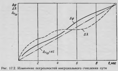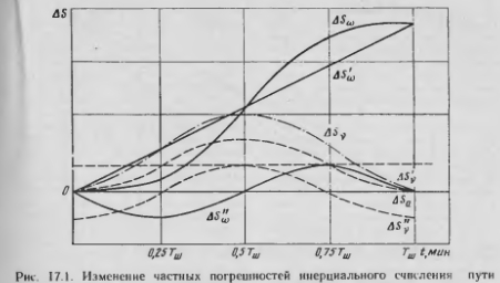 Определение навигационных элементов полета с помощью ИНСИнерциальная навигационная система (ИНС) предназначена для решения задач самолетовождения в полете по воздушным трассам и вне трасс и обеспечивает: автономное или совместно с СА выполнение полета по маршруту в соответствии с программой, введенной в нее перед полетом или в по лете; непрерывное автоматическое счис лен не и индикацию текущего МС в географической и частноортофомической системах координат; » формирование и индикацию ЗПУ и ЛБУ для автоматизированного вождения ВС в горизонтальной плоскости; вычисление и индикацию путевой скорости и угла сноса, определение и индикацию времени полета и оставшегося расстояния to ПГМ, географические координаты которого введены в НВУ; вычисление и индикацию текущих значении истинных путевого угла и курса полета; определение и индикацию навигационного направления и скорости ветра; ручную коррекцию частно-ортодромических координат МС; индикацию географических координат и номеров ОПМ, введенных в систему; информацию в цифровой форме показателей готовности (ПГ) системы к работе, сигналов компенсации уходов гироскопов и составляющих путевой скорости. ![]() ![]() При программировании полета производятся ввод фс, Хс места стоянки и поворотных пунктов (в настоящее время 9 ППМ) с помощью УВИ. В случае необходимости в полете можно ввести координаты дополнительных ППМ по мере пролета запрограммированных. На основе этой информации вычисляют ЗПУ и боковое уклонение от ЛЗП для обеспечения автоматизированного самолетовождения в горизонтальной плоскости 1. Основными источниками погрешностей определения скорости полета п координат являются: неточная вы ставка ГП по горизонту и азимуту: инструментальные погрешности AM; собственный уход ГП. Погрешность начальной выставки ГП по горизонту v0 приведет (при отсутствии других источников оши бок) к погрешности определения пути в выбранных направлениях ![]() ![]() 2. Инструментальные погрешности акселерометров Да При измерении ускорений вызывают колебательные движения ГП такого же характера, что и ошибки в начальной выставке Vo (см. рис. 17.1). Погрешности оцениваются по AS„ 6371 g — 1 Ао (1—cos0,074/), ![]() Ошибки скорости и координат носят колебательный характер и не накап ливаются во времени. Основную часть погрешности МС создают коле бания с частотой Яд — угловой скорости суточного вращения Земли. 4. Ошибки, возникающие при собственном уходе ГП шс (°/ч), ![]() Ошибки из-за собственного ухода гироскопов — основная причина,ограничивающая время автономной работы ИНС. Совместное проявление перечне лепных ошибок определяет погрешности в счислении ф, X (s, г). Они имеют вид возрастающей во времени сложной кривой (рис. 17.2). Величина радиальной СКП определения МС эксплуатируемыми ИНС в среднем Огср равна одной дуговой минуте, или 1,85 км на 1 ч полета (в первые часы полета погрешности координат не подчиняются этой закономерности и могут быть больше). Составляющие погрешности координат по взаимно перпендикулярным направлениям независимы и распределены по нормальному закону с МО, равным нулю. Воздушная навигация: справочник/А.М. Белкин. М.: Транспорт. 1988г. |