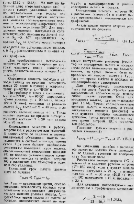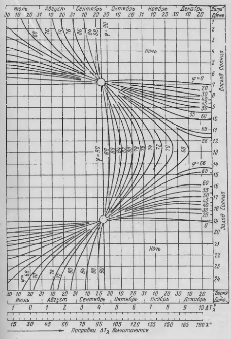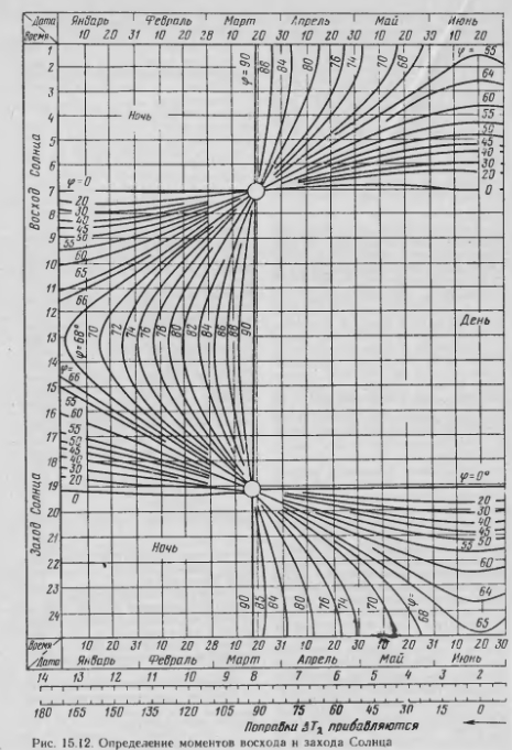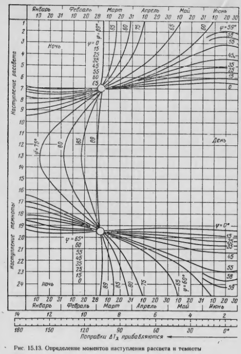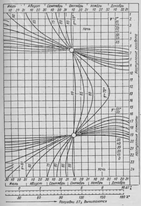 Определение времени наступления моментов естественного освещенияРасчет условий естественного освещения для любой точки земного шара можно производить с помощью авиационного астрономического ежегодника (ААЕ), кален тарного справочника и специальных графиков. С помощью АЕ можно опрстелять время восхода и захода Солнца, продолжительность сумерек и моменты наступления рассвета и темноты; области не заходящего и невосходяшего Солнца, время восхода и за хота Луны тля поверхности Земли и на высоте полета. В календарном справочнике время восхода, захода Солнца и продолжительности сумерек по московскому декретному времени для наиболее крупных городов мира. Приближенное определение моментов восхода (захода) Солнца, наступления рассвета (темноты) производится с помощью графиков (рис. 15 12 и 15.13). На них по заданной дате (горизонтальная ось) и широте пункта, указанной кривыми, по вертикальной оси (слева или справа) отмечается время наступления момента соответствующего явления по московскому декретному времени Г3 на меридиане 30°. Для определения момента наступления соответствующего явления на другой долготе х =Х—30° прибавляется поправка за долготу места, которая находится но согласованным шкалам к иЛ7. расположенным в нижней части графиков. ![]() ![]() ![]() ![]() ![]() ![]() Воздушная навигация: справочник/А.М. Белкин. М.: Транспорт. 1988г. |