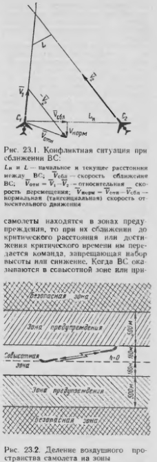 Применение систем предупреждения столкновенийВзаимное расположение двух ВС движущихся с постоянными скоростями 17 и Гг по прямолинейным пересекающимся траекториям, расположенным в горизонтальной плоскости на одной и том же высоте, показано на рис. 23.1 Интервал времени с до момента, когда L будет минимальным. ![]() Отечественная СПС типа «Эшелон — асинхронная бортовая система импульсного типа, обеспечивающая обнаружение угрозы столкновении и определение взаимно-координированных вертикальных маневров ВС по уклонению от столкновении. Информация о необходимых маневрах отображается на специальном ин 1и каторг. Опасность столкновения выявляется на основе получения и анализа данных о высотах ВС, а затем по информации о расстоянии между ними и скорости его изменения. Сведения об относительной высоте получают путем обмена данными между двумя ВС о барометрических высотах полета. Запросный сигнал СПС содержит данные о высоте ВС, с борта которого он случается. Ответное излучение несет информацию о высоте отвечающего ВС. В канале определения высот используется сложная система логического анализа обстановки. Для этого воздушное пространство в окрестностях ВС делится по высоте на Ippc. 23 2): совысотную зону, границы которой удалены на расстояние ±160 м относитетьно высоты данного ВС; две зоны предупреждения с шириной но 500 м; безопасные зоны, расположенные за внешними границами зон предупреждения. В тех случаях, когда отвечающий на запрос чайного ВС самолет оказывается в зоне предупреждения или высотной зоне, бортовая СПС выполняет операции по определению опасности столкновения пуля» измерения Ли, ?и и показателя т. После этого сравниваются текущее расстояние I. и текущее значение показателя с двумя критериальными значениями этих показателей. Первые критериальные значения соответствуют расстоянию и времени, когда должно быть начато формирование взаимно координированных маневров по уклонению, вторые к2 и т,:2 указывают момент начала выполнения этого маневра. Причем допускаются только вертикальные маневры по расхождению. Если конфликтующие самолеты находятся в зонах предупреждения, то при их сближении до критического расстояния или достижения критического времени им перелете я ком а и да, запрещающая набор высоты или снижение. Когда ВС оказываются в высотной зоне или приближаются друг к другу на определенное расстояние, начинается выработка взаимно-координированного маневра по уклонению от столкновения. ![]() Аппаратура СПС Эшелон связана с ответчиком ВРЛС и с самолетным переговорным устройством. Через бортовой передатчик ВРЛС на землю автоматически перелается информация об обнаруженной с помощью СПС конфликтной ситуации и предполагаемых маневрах по уклонению. В самолетное переговорное устройство вводится сигналы оповещения экипажа самолета об угрозе столкновения. Эти сигналы имеют форму прерывистых звуковых посылок. ![]() Из-за малой дальности обнаружения самолетов БРЛС достаточно эффективна для предотвращения столкновений только при попутно-пересекающегося курсах конфликтующих ВС. Если же ВС перемещаются на встречных или встречно пересекающихся курсах, то слишком малым оказывается продолжительность радиолокационного контакта. Кроме того, для предупреждения опасных сближении с использованием бортового радиоло