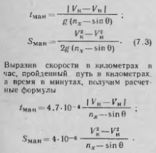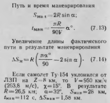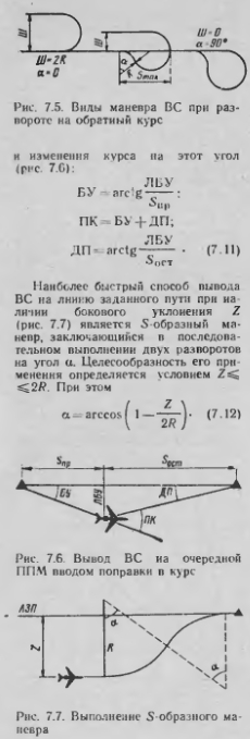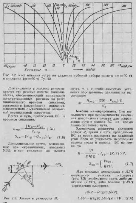 Расчет элементов пространственного маневра ВСВ процессе полета ВС выполняют маневрирование в горизонтальной (продольное и боковое) и вертикальной плоскостях. Продольное маневрирование. Оно выполняется при необходимости изменения скорости полета как в горизонтальной плоскости (0 = 0), так и при наборе (А>0) высоты и снижении (О<0). При условии постоянства продольной перегрузки пх- const продолжительность маневра и протяженность участка разгона (УкУн) от начальной 1н до конечной V,, скорости или торможения (Ук< Ун) ![]() Маневрирование в вертикальной плоскости. Оно выполняется при необходимости изменения высоты по лета. В процессе набора заданного эшелона после взлета и снижения до высоты круга происходит полет по некоторой пространственной траектории переменной кривизны. Это является следствием изменения вертикальной и истинной воздушной скоростей полета в широких пределах. Кроме того, изменяется и вектор ветра. Для набора высоты рекомендуются три режима: экономический, обеспечивающий наименьшие эксплуатационные расходы на рейс; максимальной дальности, соответствующий минимальному расходу топлива на весь полет; максимальной скороподъемности, соответствующий наименьшей продолжительности набора высоты. Вертикальные и приборные скорости полета устанавливаются в зависимости от полетной массы ВС, температуры и высоты полета. Они указываются в РЛЭ по тинам ВС. Если принять средние значения воздупиой, вертикальной скоростей и ветра, то продолжительность маневрировании и протяженность участка набора от начальной Нп до конечной Нк высоты рассчитываются по формулам: ![]() Например при наборе высоты от 600 то 9600 м с вертикальной скоростью 15 м/с на Уср = 700 чм ч (195 м/с) и попутном эквивалентном ветре ср = 72 км/ч (20 м/с) получаем нап=10 мии, S и а л = 129 км. Изменение скорости ветра приводит к увеличению при попутном ветре и ее уменьшению при встречном. Характер изменения удаления рубежа набора заданного эшелона 5Няп в зависимости от эквивалентного ветра L/л показан на рис. 7.2. Набор высоты 4000 м до 10 000 м при Uэ = —100 км/ч приводит к сокращению S„a6 на 23 км по сравнению с данными, РЛЭ Если установлен определенный рубеж набора заданного эшелона SBae. то в зависимости от скорости эквивалентного ветра будет изменяться потребное значение вертикальной ско рости ![]() ![]() Учет влияния ветра на траекторию ВС и процессе разворота и вывода его на ЛЗП осуществляется вводом поправки ДЛУР в линейное упреждение разворота ![]() Знак ДЛУР определяется знаком JK-виналентного ветра, соответствующе го полету на текущем участке маршрута. Порядок расчета ЛУР показан на номограмме пунктиром (рис. 7.4). Расчет элементов разворота на обратный курс с точным выводом ВС на ЛЗП. смещенную на величину Ш, производится при навигационном обеспечении многих авиационных работ. Если смещение смежных маршрутов Ш<2А, то необходимо выполнить специальный маневр с отворотом ВС на заданный УГОЛ (рис 7.5): при штиле ![]() ![]() ![]() Если самолет Ан-2 необходимо вывести на новую ЛЗП, отстоящею от первой на 800 м, нрн V = 200 км/ч ![]() ![]() Воздушная навигация: справочник/А.М. Белкин. М.: Транспорт. 1988г. |