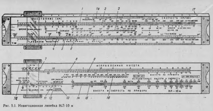 Счетные инструментыВ процессе предполетной подготовки и в полете экипажу приходится выполнять большой объем вычислительних работ. Для этого используются навигационная счетная линейка НЛ-10м. ветрочет, навигационный расчетчик НРК-2 и электронно вычислительные машины. Навигационная линейка. С помощью НЛ-10м решаются практически все задачи но самолетовождению и выполняется ряд других вычислительных операций, требующих умножения и деления, возведения в квадрат и извлечения корня, использования тригонометрических функций. Она устроена по принципу обычной счетной логарифмической линейки и позволяет сложные математические действия над числами по умножению и делению заменить на более простые — сложение и вычитание отрезков шкал, выражающих в определенном масштабе логарифмы этих чисел. Например, вычисление выражений S = Wl и W=Slt выполняется действиями gS = lg tf-+lgi и g№ = lgS — lg соответственно. Навигационная линейка (НЛ) со стоит из корпуса, движка и бегунка с визирной риской (рис. 5.1) На корпусе и движке нанесены шкалы, индексы, формулы и надписи. Всего имеется 18 шкал, которые предназначены для: ![]() ![]() Вычисления путевой скорости, времени полета и пройденного расстоя ния произвотятся с использованием шкал 1 и 2 и расположенных на угольный индексы служат также для умножения и деления: первый на 3,6 с, второй — на GO мин или 1 ч. Положение шкал линейкн и индексов при решении задач принято изображать в виде алгоритмов («ключей»). Значения чисел, нанесенных на шкалы, можно увеличивать и уменьшать в любое число аз, кратное десяти. Для умножения чисел прямоугольный индекс с цифрой 10 или 100 шкалы 2 необходимо установить на множимое, а против множителя отсчитать по шкале I произведение (рис. 5.2). Число знаков произведения определяют в уме или по правилам умножения чисел на логарифмической линейке. Для умножения и деления, причем с большей точностью, можно пользоваться шкалами 14 и 15: при вычислении произведения против множимого на шкале 15 устанавливается цифра -fiool Ull loooj шкалы 14 и прот1В множителя (берется по шкале 14) по шкале 15 считывается результат. Для вычисления тригонометрических функций пользуются шкалами 3. 4, 5 (рис. 5.3). ![]() Поскольку задачи по определению пройденного расстояния S, скорости и времени полета t есть операции умножения и деления, то они выполняются на шкалах 1 к 2. Потому они и называются шкалами расстояний, скорости и времени (рис. 5.4 и 5.5). При выполнении этих расчетов пользуются индексами: круглым, если t выражается в секундах; треугольным, если t берется в минутах (путевая скорость выражается в километрах в час, а расстояние в километрах в обоих случаях). Для возведении в квадрат и извлечения корня пользуются шкалами 5, 6 (рис. 5.6). Знание алгоритмов облегчает и убыстряет решение навигационных задач без запоминания описывающих их зависимостей. Например, определение 1Г и УС решением навигационного треугольника скоростей (НТС) по формуле (3.10) с использованием алгоритма производится легко и быстро, хотя при этом выполняется девять операций умножения, деления и вычисления тригонометрических функций. Навигационный расчетчик комбинированный. Он представляет комбинацию НЛ и ветрочета и является счетным инструментом, предназначенным для выполнения расчетов при подготовке к полету и в полете, по применению авиации в народном хозяйстве и ряда вы