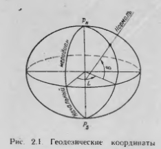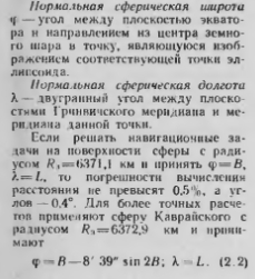 Системы координат на эллипсоиде и сфереЗемной эллипсоид является геометрическим телом, образованным вращением эллипса вокруг его малой оси. Точки пересечения оси вращения с поверхностью эллипсоида называются полюсами Параллелью эллипсоида называется окружность, обработанная сечением эллипсоида плоскостью, перпендикулярной оси вращения. Сечение эллипсоида плоскостью, проходящей через ось вращения, образует меридиан, представляющий собой эллипс с полуосями о и Ь Перпендикуляр к плоскости, касательной к поверхности эллипсоида в данной точке, называется нормалью к поверхности эллипсоида в данной точке Нормаль в общем случае не проходит через центр эллипсоида, но лежит в плоскости меридиана. Плоскость, проходящая через нормаль. называется нормальной, а след от ее сечения называется нормаль ним сечением (вертикалом). Нормальное сечение перпендикулярное к меридиану, называется сечением первого вертикала. ![]() ![]() ![]() Астрономические координаты используются для определения положения точки на поверхности Земли (геонда) (рис. 22). Астрономической широтой точки на поверхности Земли называется угол, заключенный меж плоскостью экватора и направлением отвесной линии в этой точке. Астрономической долготой Л точки на поверхности Земли называется тиугранный угол, заключенный между плоскостями Гринвичского меридиана и астрономического меридиана точки Так как отвесные лижаки совпадают с нормалями к эллипсоиду, а астрономические меридианы не совпадают с геодезическими, астрономические координаты отличаются от геодезических, При приближенном решении некоторых задач, когда разность между геодезическими и астрономическими координатами несущественна. их объединяют названием географические координаты. Нормальными сферическими координатами (рис. 2.3) пользуются тля решения задач на поверхности сферы ![]() При этом относительная погрешность определения расстояния не превысит 0.08%, а углов— 0,Г. Для достижения еще более высокой точности необходимо решать за чачи на поверхпости эллипсоида. Воздушная навигация: справочник/А.М. Белкин. М.: Транспорт. 1988г. |