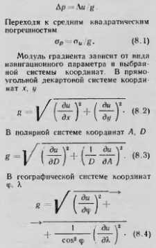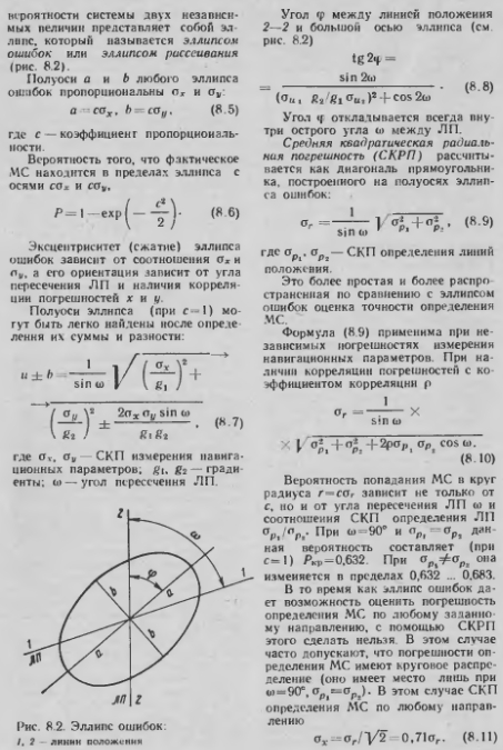 Точность определения ЛП и места ВСИзмеренному в полете значению навигационного параметра и соответствует определенная изолиния (линия положения). Погрешность измерения и вызывает погрешность определения положения изоляции. Для ее оценки используется понятие градиента навигационного параметра. Градиентом g называется вектор, характеризующий скорость возраста ![]() ![]() ![]() Модули градиентов наиболее часто используемых в навигации линий положения приведены в табл. 8.1 С помощью данной таблицы и соотношения (8.1) можно оценить точность определения линии положения, если известна средняя квадратическая погрешность измерения навигационного параметра. Если строится навигационного параметра, который непосредственно не измеряется, а рассчитывается с помощью измеряемых, то его средняя квадратическая погрешность оценивается по средним квадратическим погрешностям измеряемых параметров (приложение 3) Например, при определении пеленга самолета ПС по курсу у и курсовому углу радиостанции ![]() ![]() Если ЛП и МС определяются графически на карте, то необходимо учитывать погрешности прокладки. При работе на карте СКП измерения расстояния а, = 0,8 мм (на местности СКП может быть найдена с помощью масштаба карты), а углов пеленгов ап=0,8°. Наличие систематической погрешности измерения навигационного параметра вызывает постоянное смещение ЛП При использовании обобщенного метода линий положения МС. может быть определено по двум ЛП. Точка их пересечения — точка наиболее вероятного положения ВС. Однако вследствие погрешностей навигационных измерений полученные ЛП не проходят через фактическое МС. Том ка пересечения ЛП занимает случайное положение относительно фактического МС. При оценке точности удобнее считать, что МС рассеяно относительно точки пересечения ЛП Достаточно полная оценка точности определения МС дается с помо шью эллипса ошибок. При этом пред полагается: грубые ошибки измерении (промахи) исключены; систематические погрешности определены и устранены введением поправок; случайные погрешности измерений подчинены нормальному закону. Если навигационные параметры и, и и2 измерены соответственно с погрешностями х и у, то плотность распределения МС будет описываться двумерным нормальным законом распределения (см. приложение 3) f(x, у). Поверхность f(x, у) имеет куполообразную форму с максимумом, соответствующим наиболее вероятному местоположению ВС (в точ ке пересечения ЛП). Сечение поверхности f(x, I/) горизонтальными плоскостями дает эллипсы (см. рис. П. 12). Геометрическое место то чек равной и постоянной плотности вероятности системы двух независимых величин представляет собой эллипс, который называется эллипсом ошибок или эллипсом рассеивания (рис. 8.2). ![]() ![]() Воздушная навигация: справочник/А.М. Белкин. М.: Транспорт. 1988г. |
