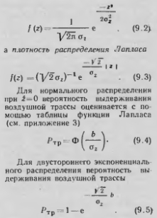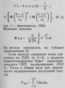 Вероятность выдерживания воздушной трассыДля оценки качества воздушной навигации, помимо показателей точности, используются и вероятностные показатели. Вероятность нахождения ВС в пределах воздушной трассы — один из наиболее часто используемых показателей. Пусть при контроле пути по направлению установлено, что линейное боковое уклонение составляет, а также известна СКП определения этой величины ог. Тогда в предположении нормального закона распределения погрешности определения г. вероятность того, что МС находится в пределах трассы шириной ±Ь: ![]() Вид плотности распределения устанавливается исходя из экспериментальных статистических данных о траекториях движения ВС Наиболее часто экспериментальные данные аппроксимируются нормальным распределением и двусторонним экспоненциальным распределением (распределением Лапласа). В обоих случаях математическое ожидание (центр распределения) боковых уклонений принимается равным НУЛЮ, так как уклонения вправо и влево от ЛЗП считаются равновероятными. В этом случае плотность нормального распределения ![]() При значениях b, не превышающих двух-трех средних квадратических отклонений ог, значения Рт рассчитанные по формулам (9.4) и (9.5) близки. При больших значениях необходимо пользоваться законом распределения Лапласа, так-как нормальный закон лает в этом случае завышенные по сравнению с экспериментальными данными значения РТу. Воздушная навигация: справочник/А.М. Белкин. М.: Транспорт. 1988г. |